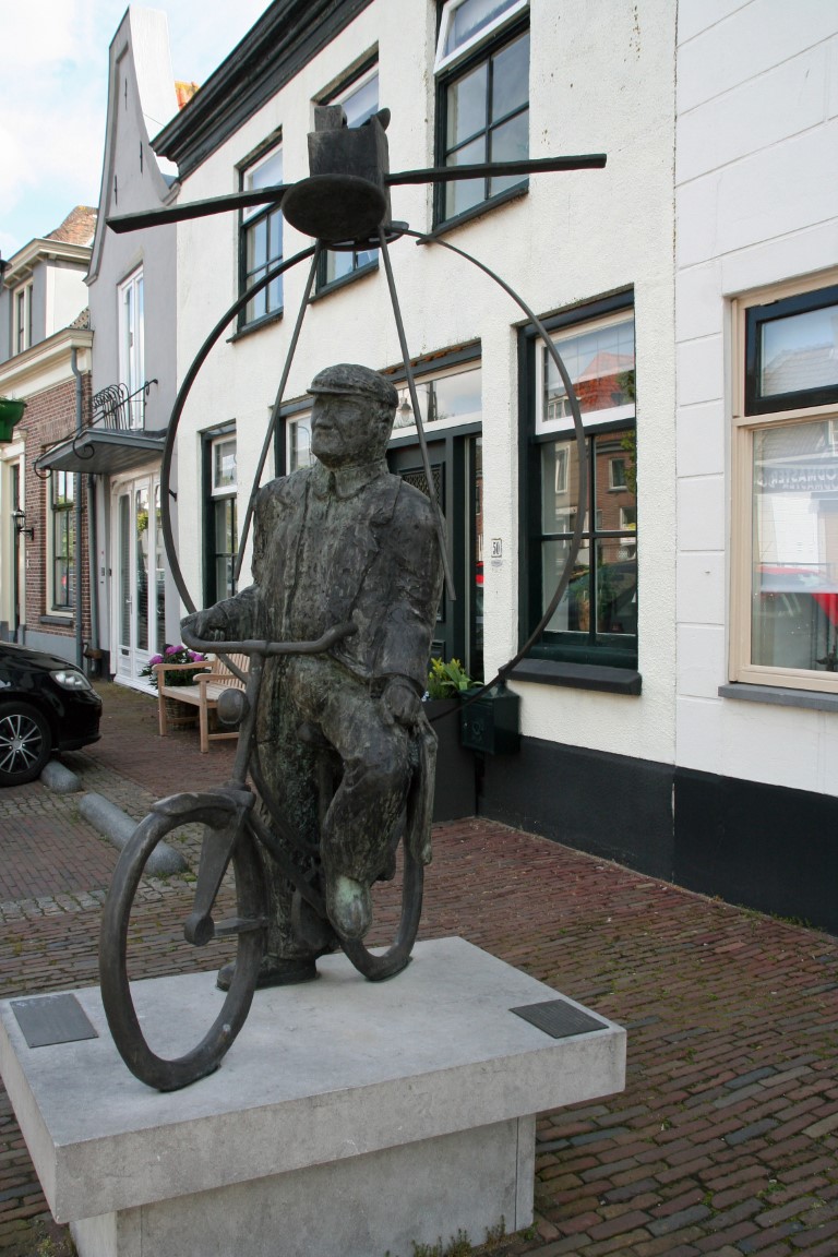 Beeld van een dorpsomroeper op de fiets, met op zijn rug een communicatiesatelliet.
