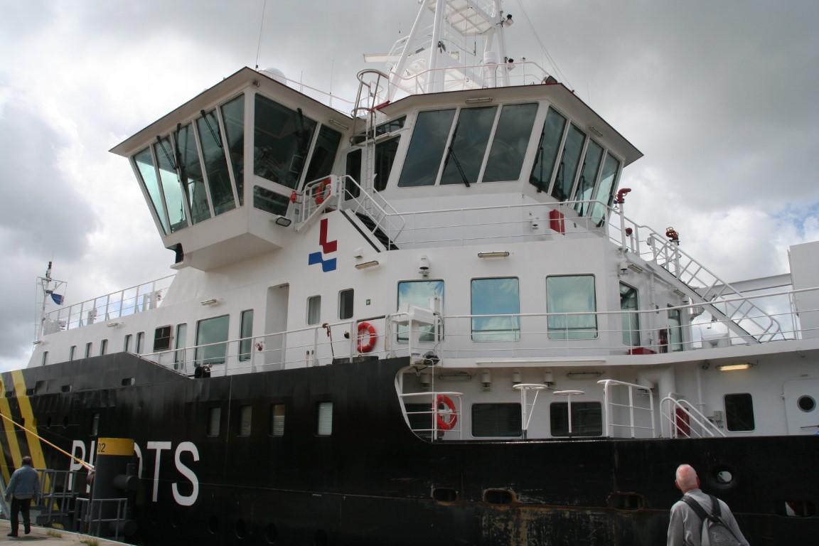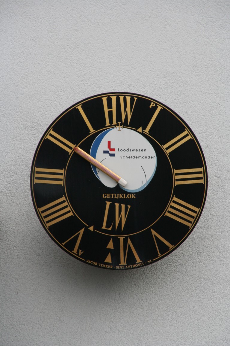 Een van de eerste gebouwen die we tegenkomen is de Belgische Loodsensociëteit met daarnaast de Nederlandse Loodsensociëteit. Op de rechter foto een getijdenklok. De getijdenklok geeft een indicatie van het gemiddelde getijverloop voor de rede van Vlissingen. Klik op de link om de werking van deze klok te zien.