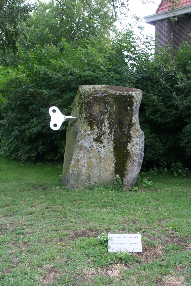 Het basaltblok is voorzien van een sleutel, die de suggestie wekt dat er een mechaniek verborgen is. Bij het rotsblok staat de tekst “Miljoenen jaren deel van een massief , op het punt van bewegen”, hetgeen uiteraard een geweldig contrast geeft. (1986)