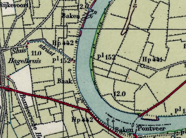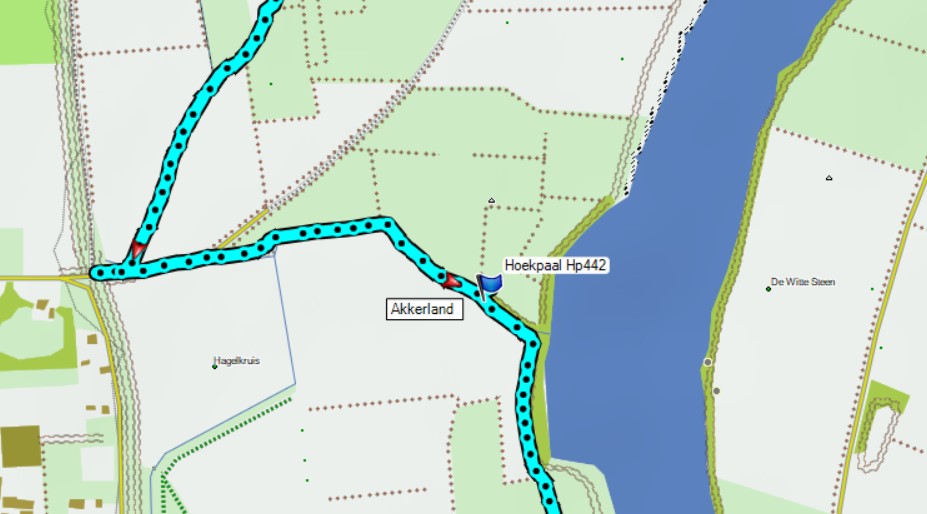 Hoekpalen geven de positie aan van een meetpunt dat de afstanden tot drie posities weer. De op het terrein (i.d.g. langs de zijdes van de Maas) verzekerde hoekpunten van het driehoeksnet dienen in de eerste plaats als uitgangspunt voor de detailmeting der rivierkaart.