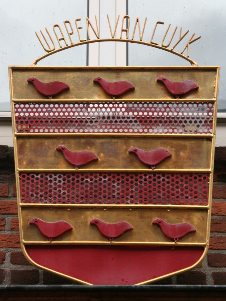 - Wapen van Cuijk: Het wapen is afgeleid van het familiewapen van het geslacht van Cuijk, met daaraan toegevoegd een kroon. Het wapen bevat 8 zogenaamde merletten. De merlet, ook wel merlaan genoemd, is een heraldisch wapendier. De merlet kreeg zijn aparte vorm zonder snavel en poten vanaf de 13e eeuw. Volgens de overlevering zouden alleen ridders die aan kruistochten hadden deelgenomen merletten in hun wapen hebben mogen dragen.