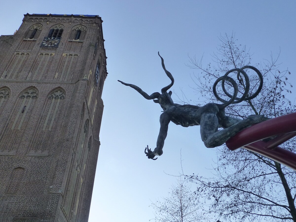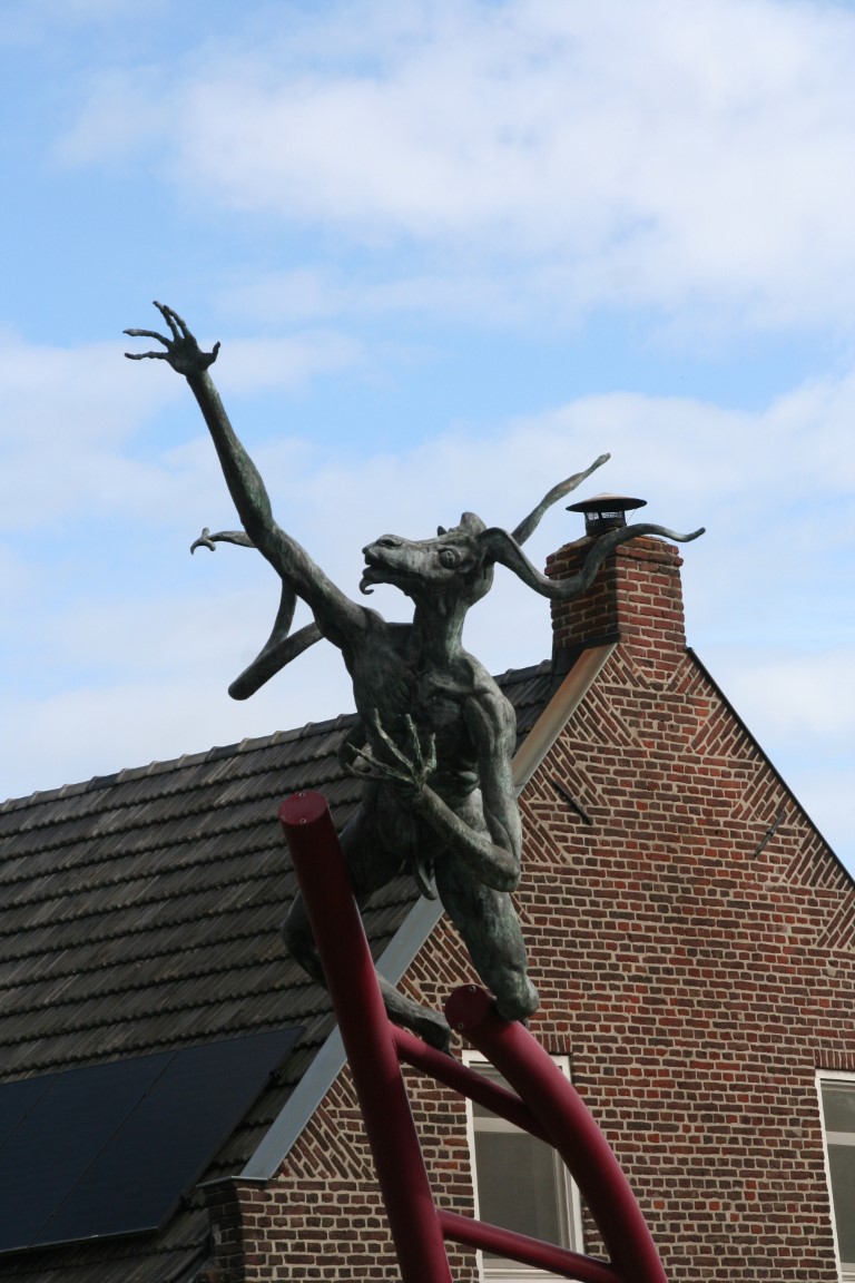 Beeld van de duivel die een greep doet naar de kerkklok. De legende van het Duvelsklökske. Het gebeurde in een Kerstnacht, eeuwen geleden. De pastoor had een klok in de toren laten hangen maar had vergeten deze kerkklok te zegenen. En dat heeft hij geweten. Midden in de Kerstnacht verscheen de duivel en stal de klok uit de toren van Sambeek en begroef hem wat verderop in het moeras “de Lins”. En sindsdien luidt, elke Kerstnacht opnieuw, de duivel om klokslag twaalf uur de Sambeekse klok.