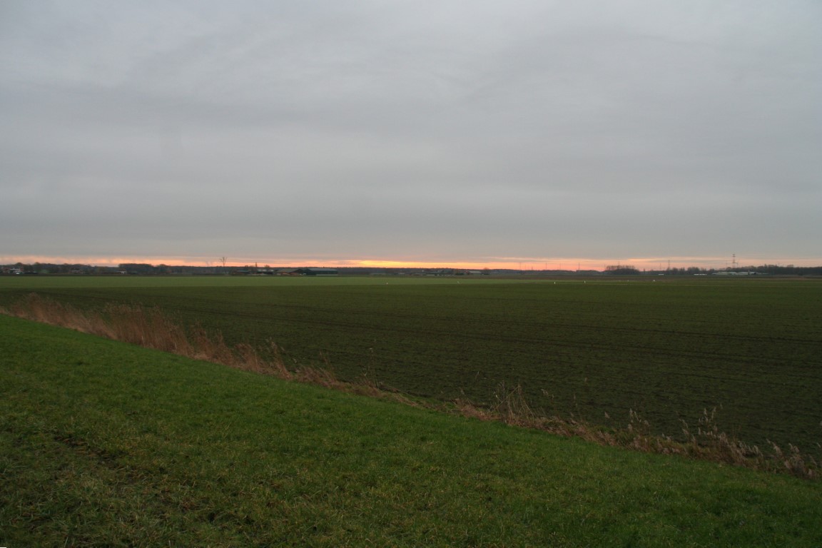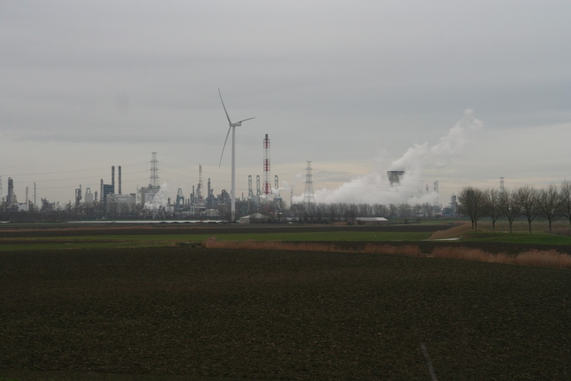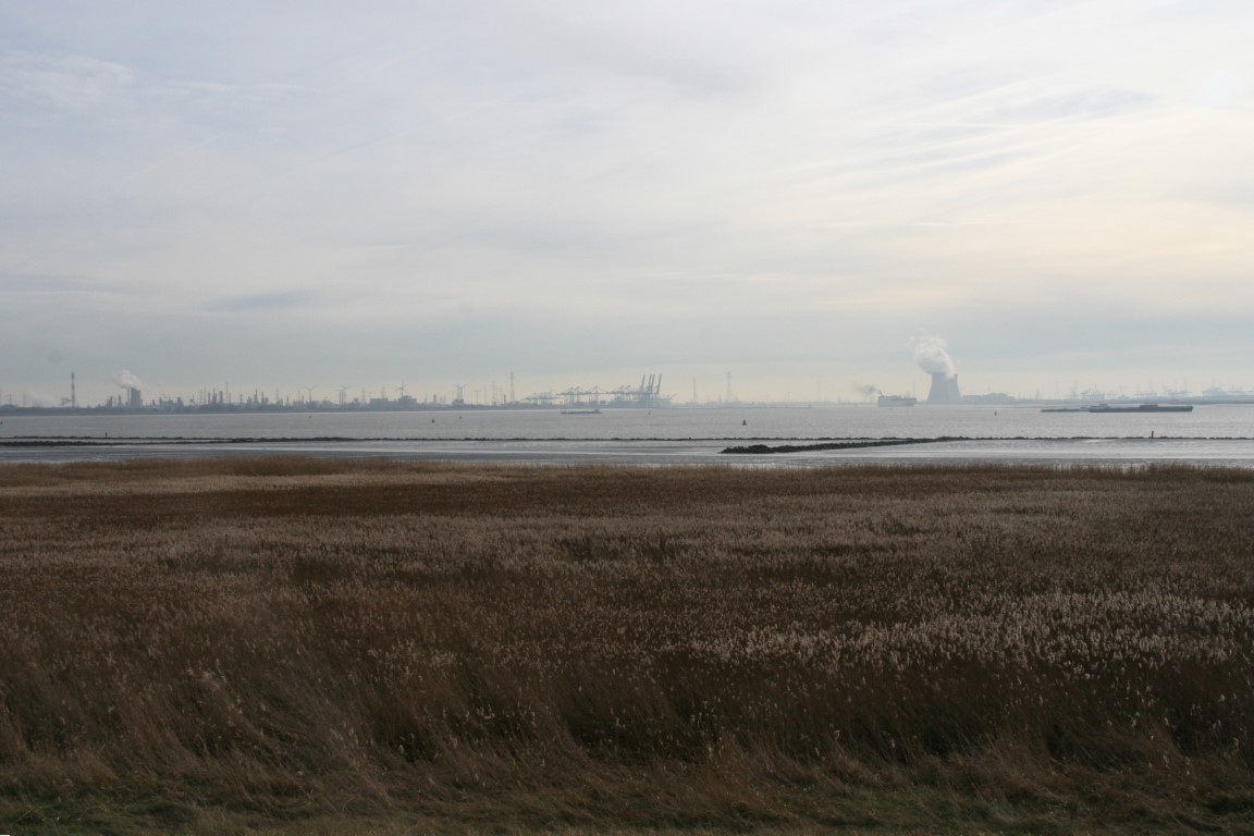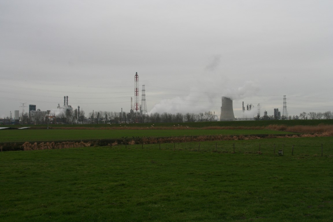 We zijn hier dicht bij de grens tussen Nederland en België. We zien in de verte, bij een opgaande zon, de industrie nabij Antwerpen.