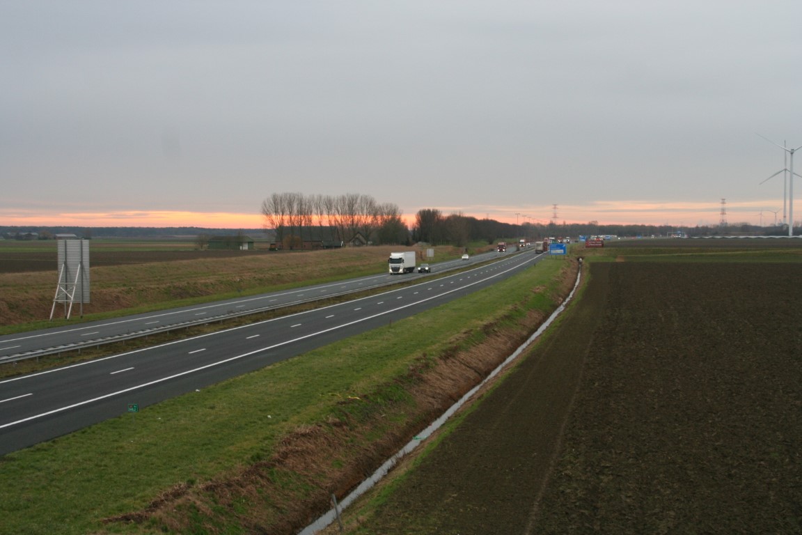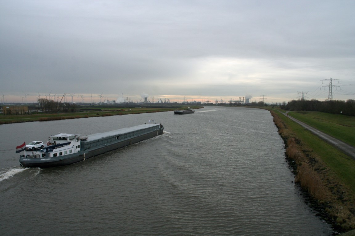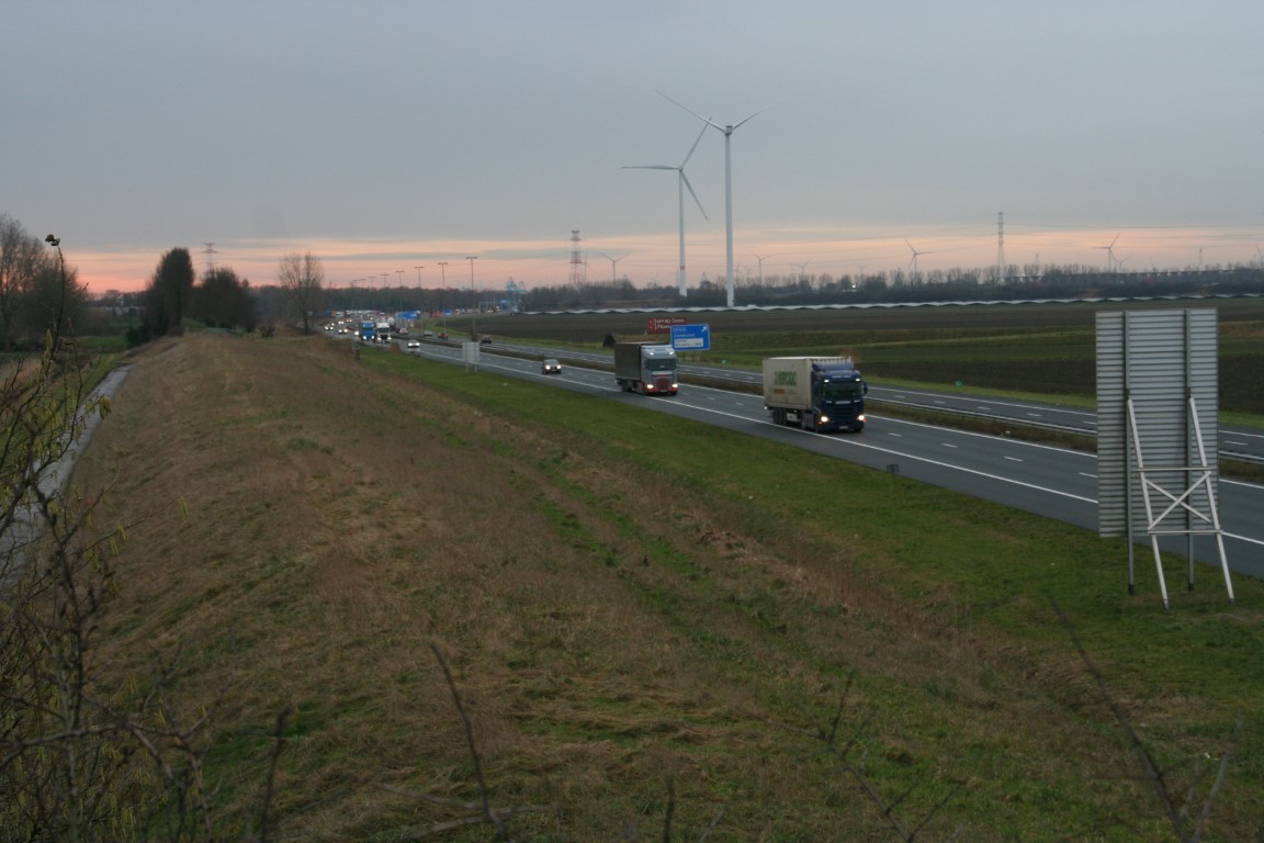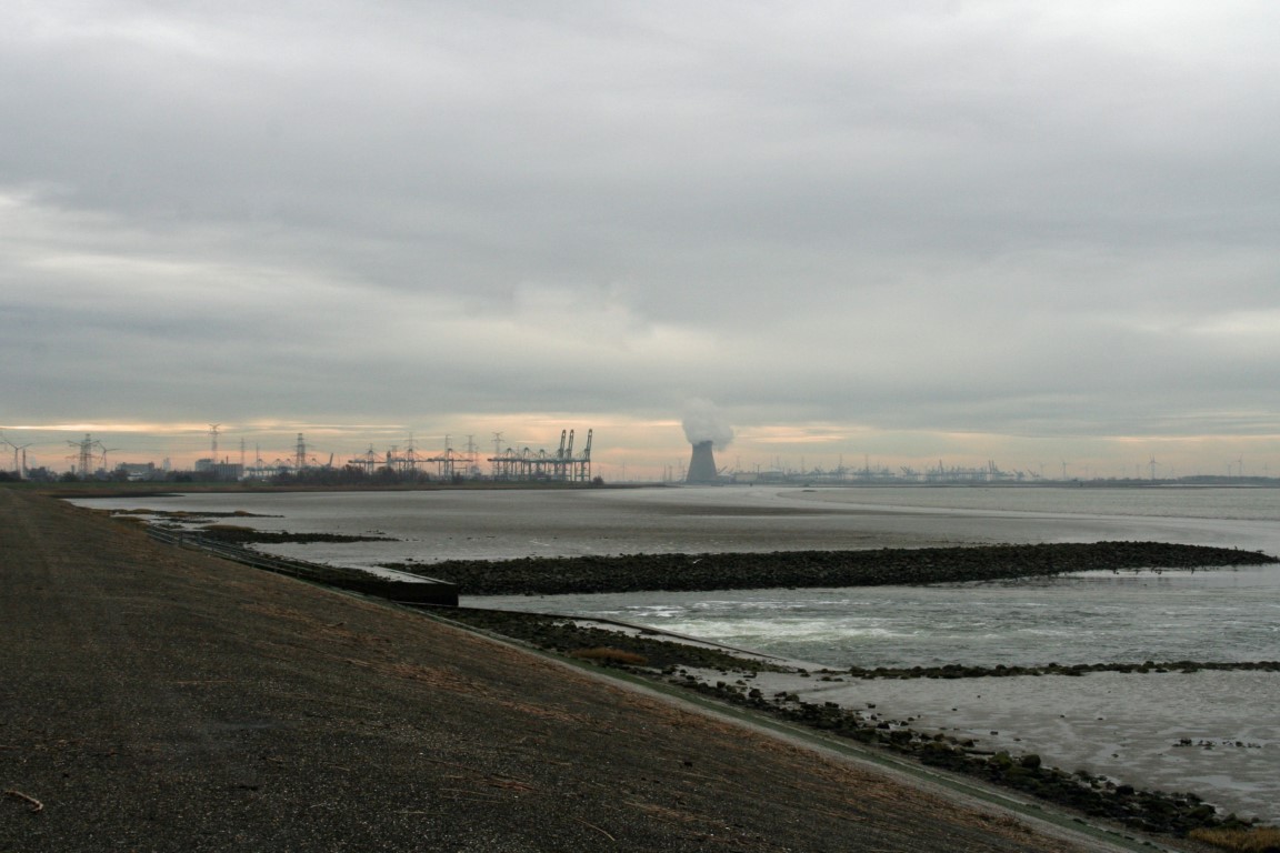 We zijn hier dicht bij de grens tussen Nederland en België. We zien in de verte, bij een opgaande zon, de industrie nabij Antwerpen.