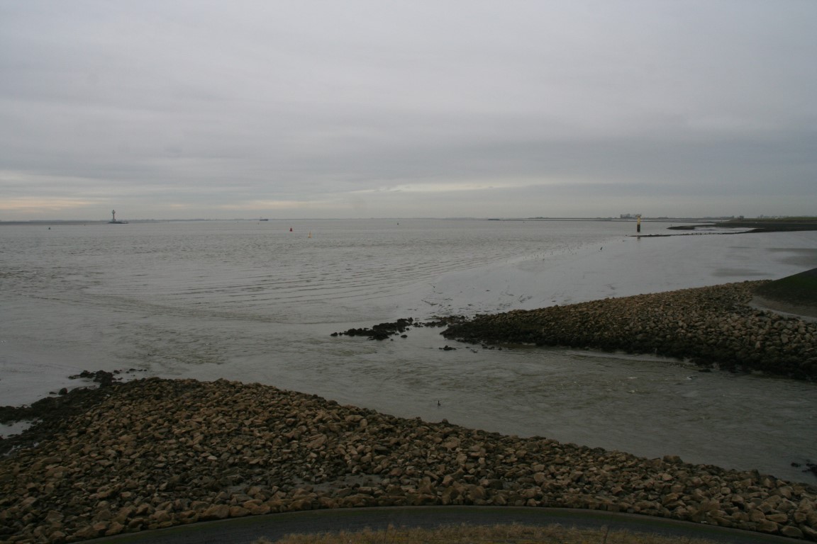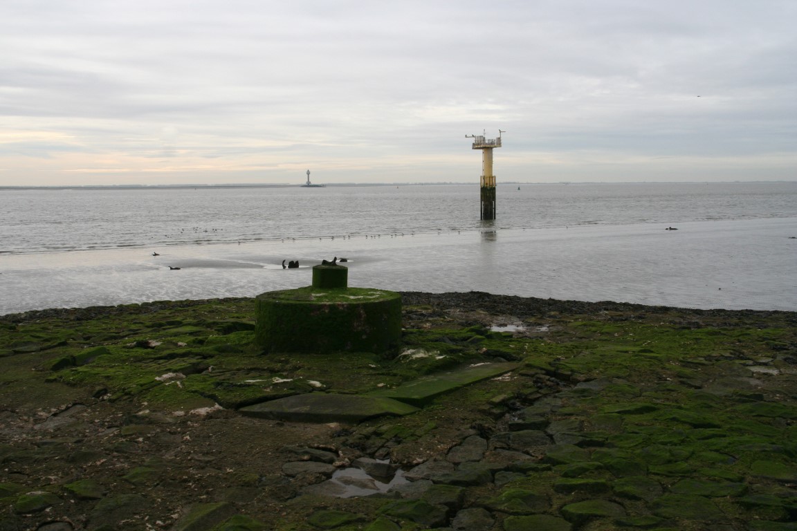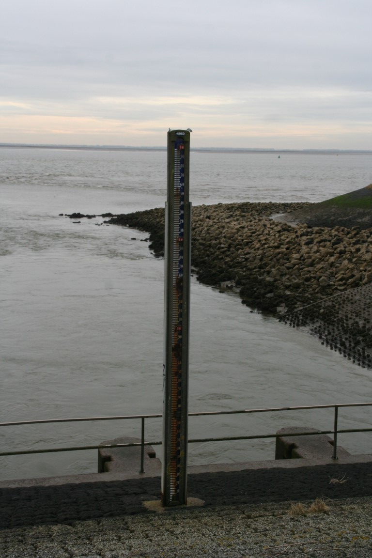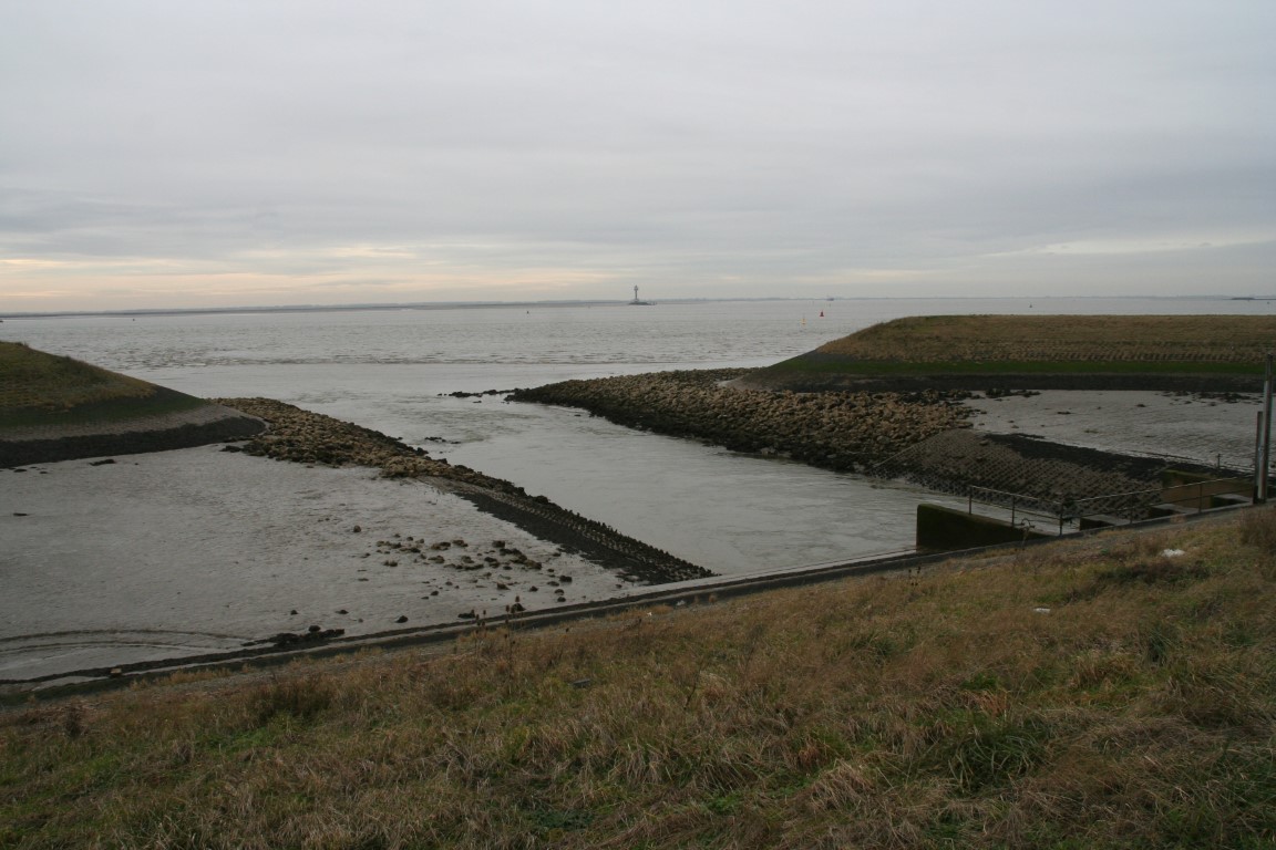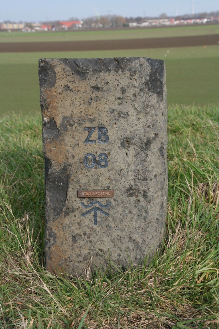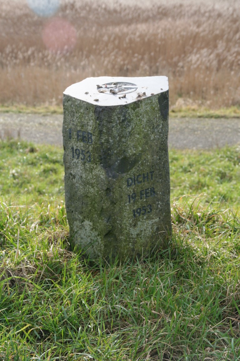 Eén van de 96 stroomgaten waar na de ramp in 1953 het water voor lange tijd dag en nacht naar binnen en buiten stroomde. Deze diepe gaten waren moeilijk te dicht te maken. Op deze paaltjes staat niet alleen waar het stroomgat vroeger was, maar ook wanneer deze is gerepareerd.