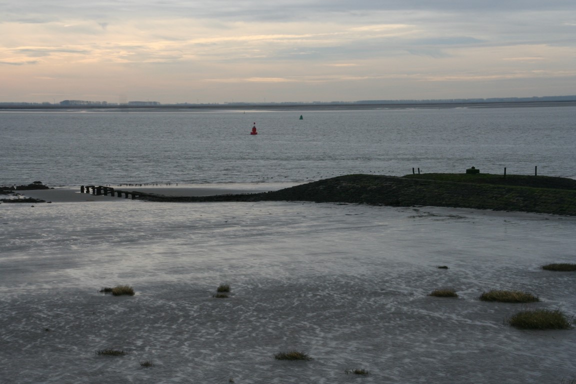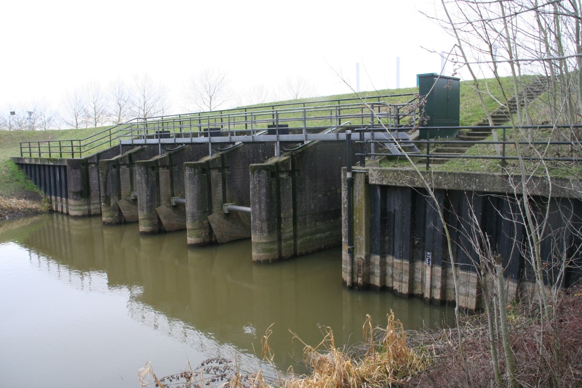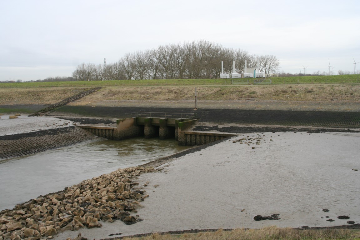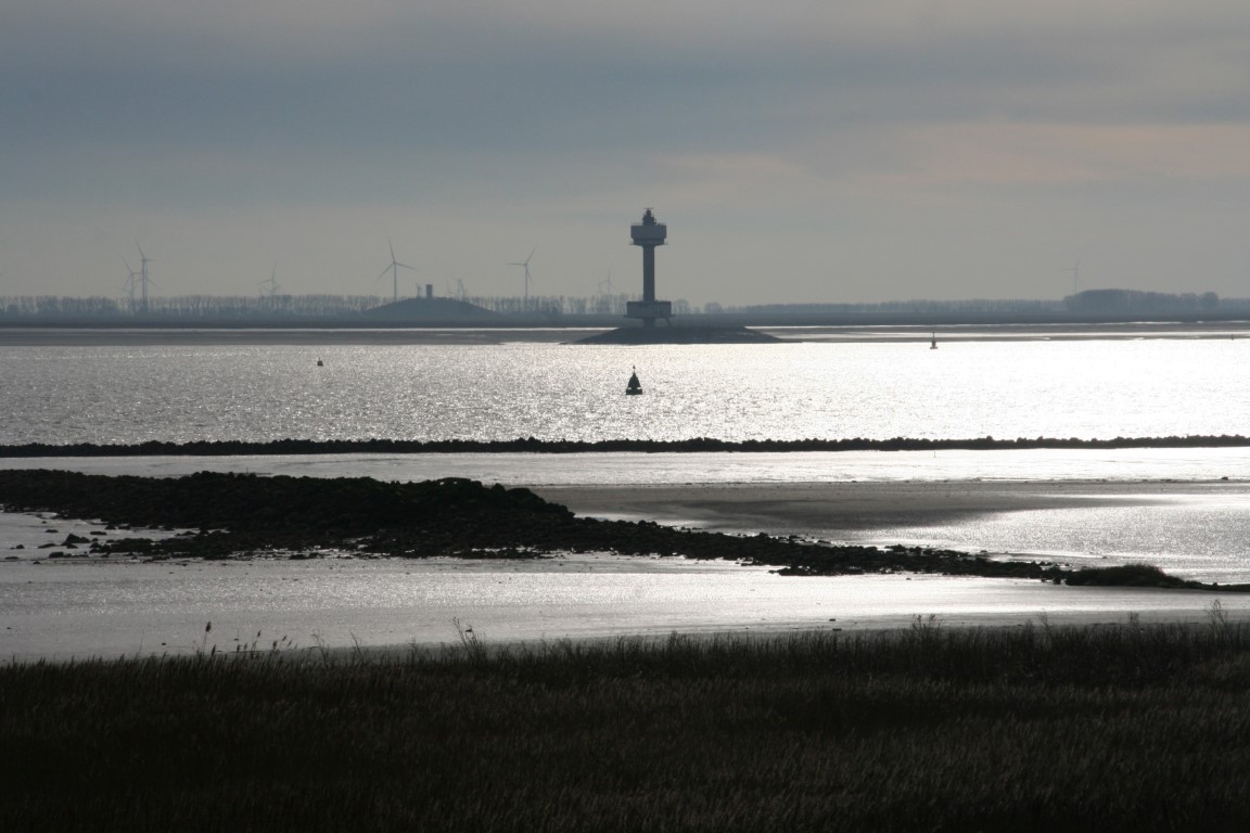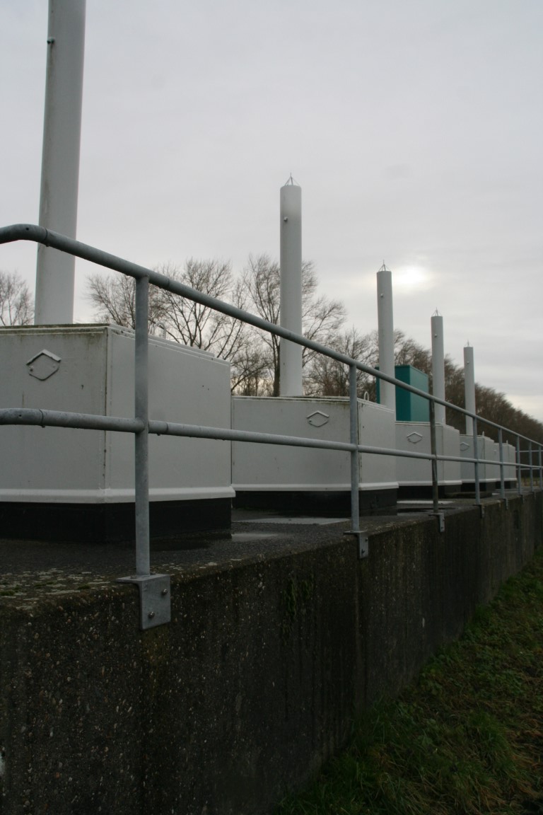 Eén van de 96 stroomgaten waar na de ramp in 1953 het water voor lange tijd dag en nacht naar binnen en buiten stroomde. Deze diepe gaten waren moeilijk te dicht te maken. Op deze paaltjes staat niet alleen waar het stroomgat vroeger was, maar ook wanneer deze is gerepareerd.