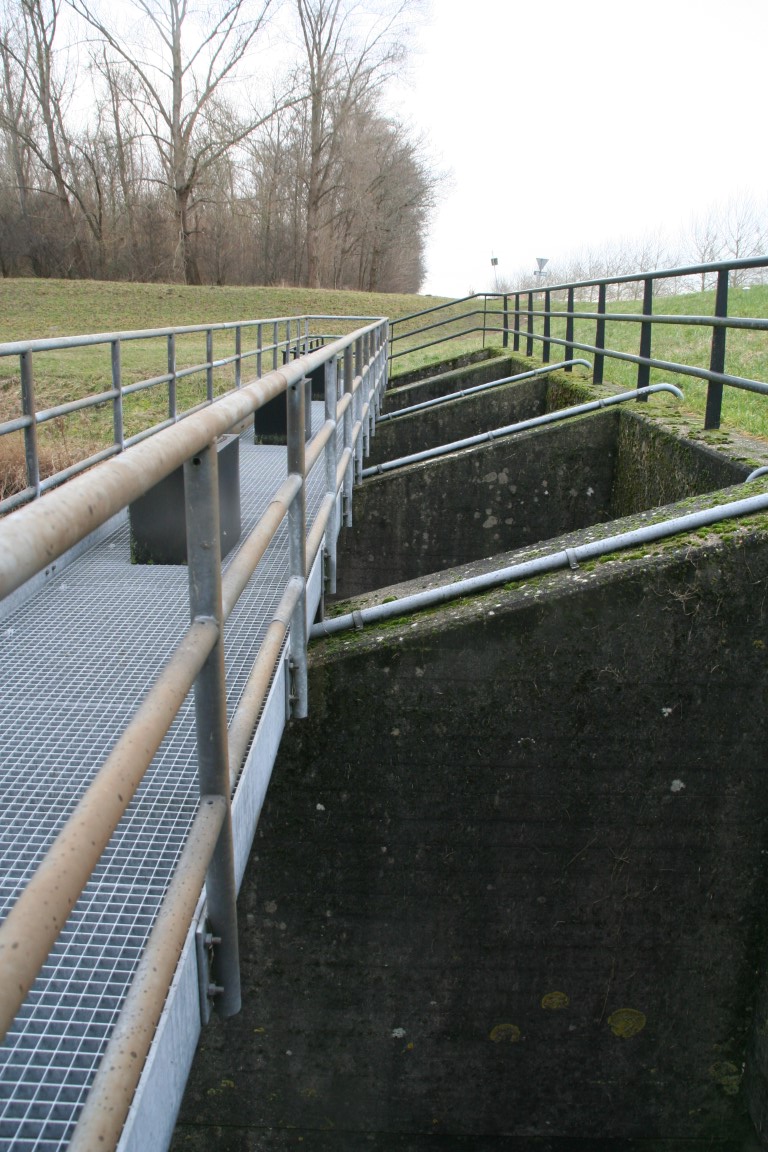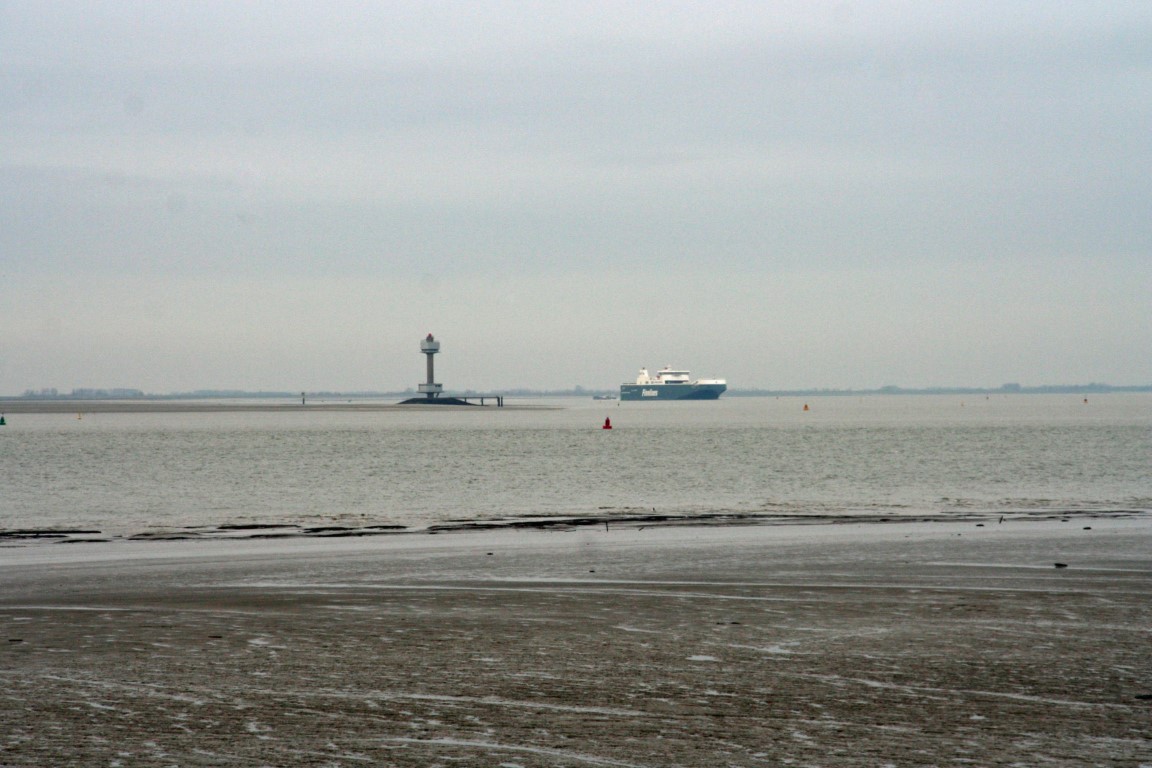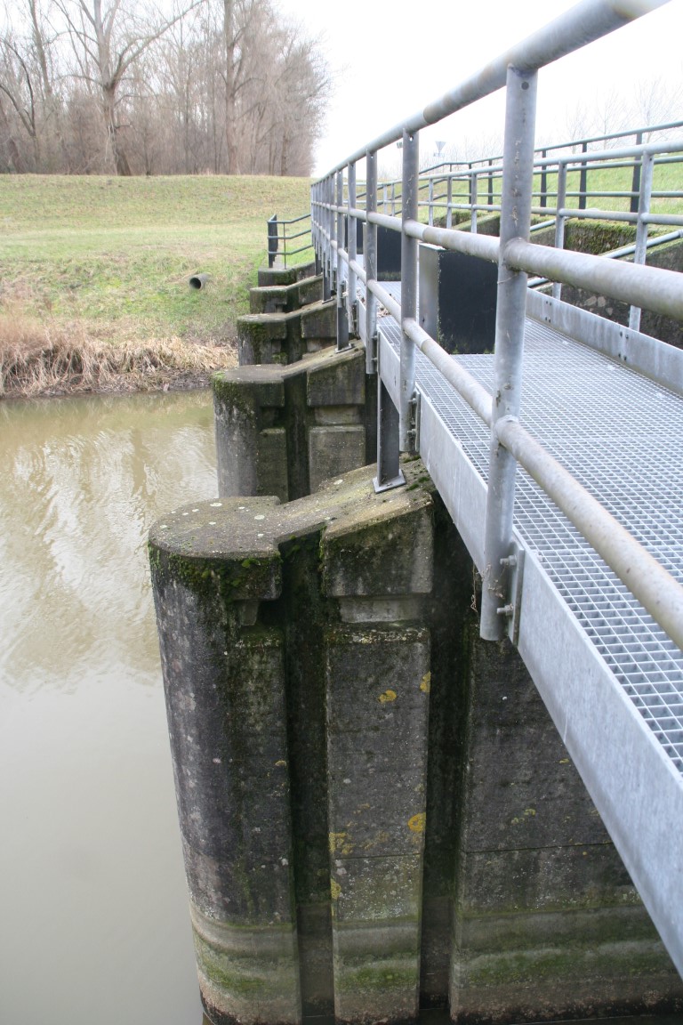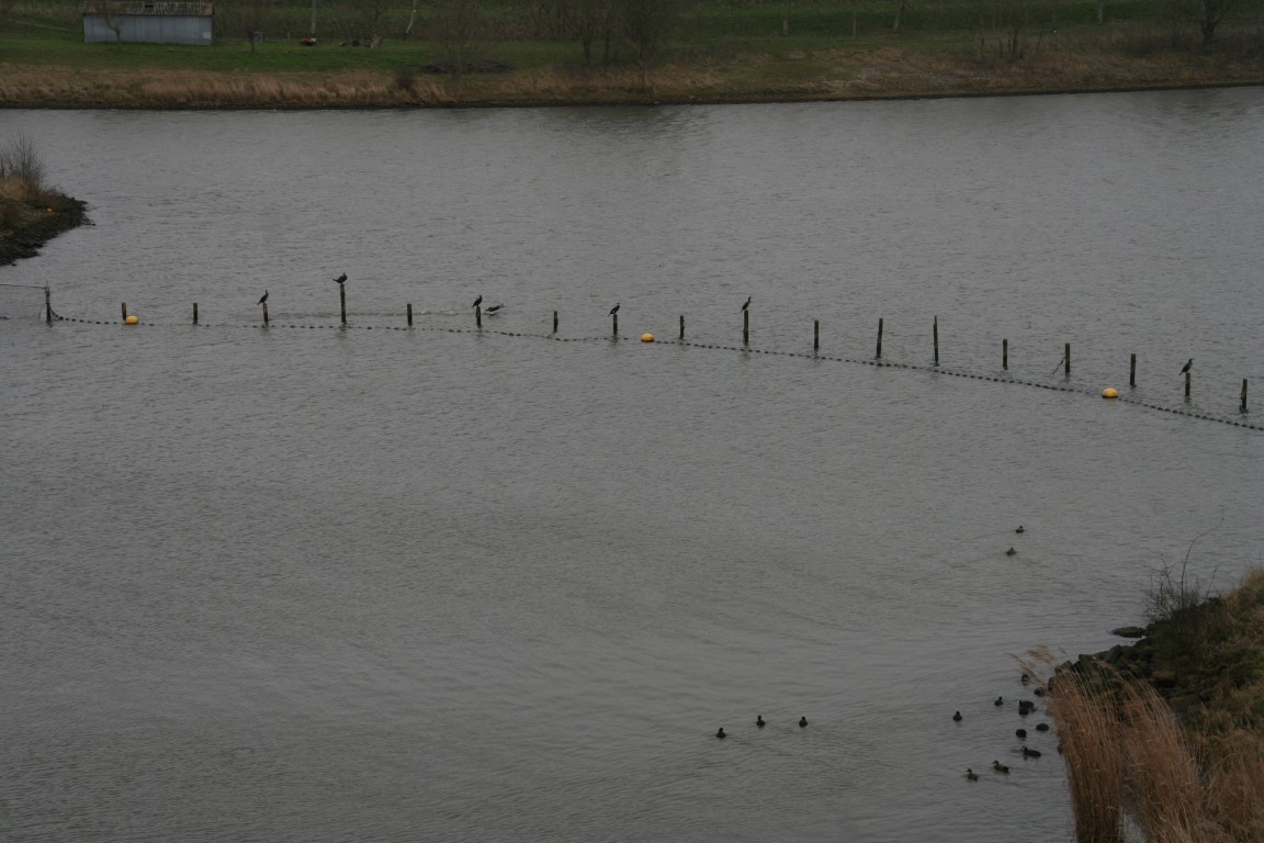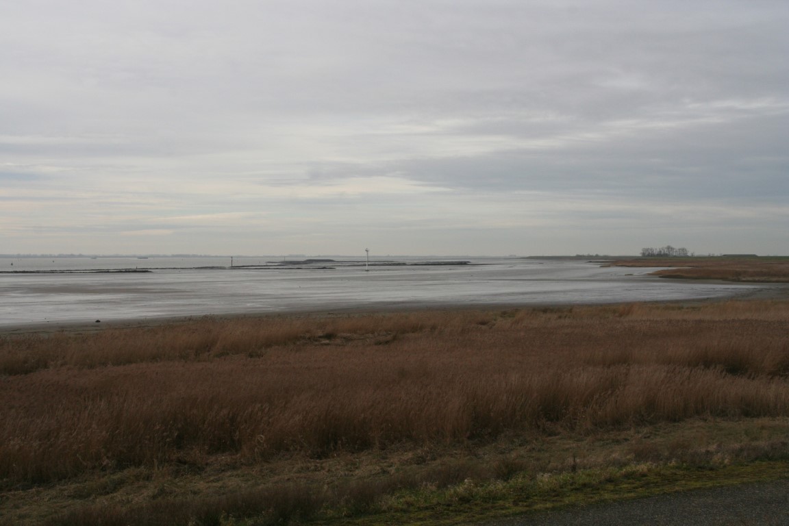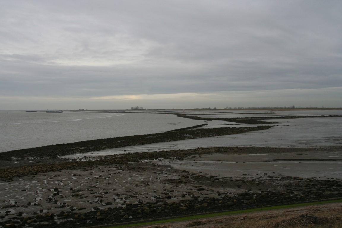 Eén van de 96 stroomgaten waar na de ramp in 1953 het water voor lange tijd dag en nacht naar binnen en buiten stroomde. Deze diepe gaten waren moeilijk te dicht te maken. Op deze paaltjes staat niet alleen waar het stroomgat vroeger was, maar ook wanneer deze is gerepareerd.