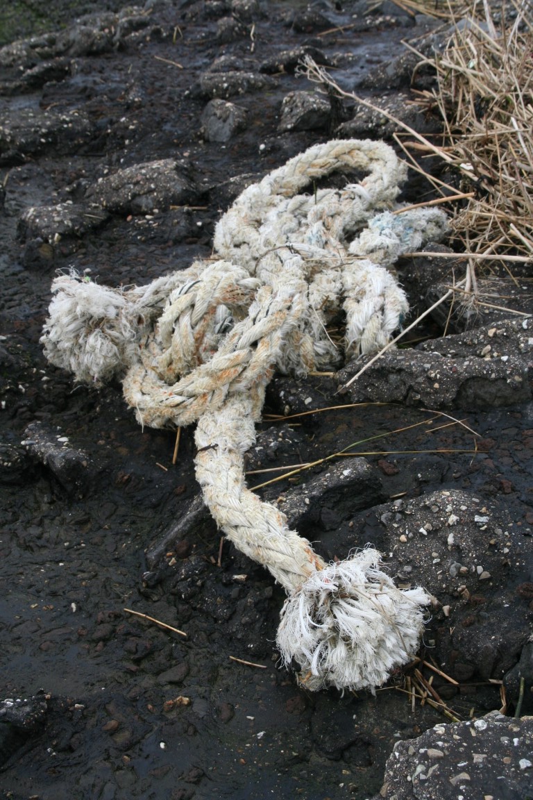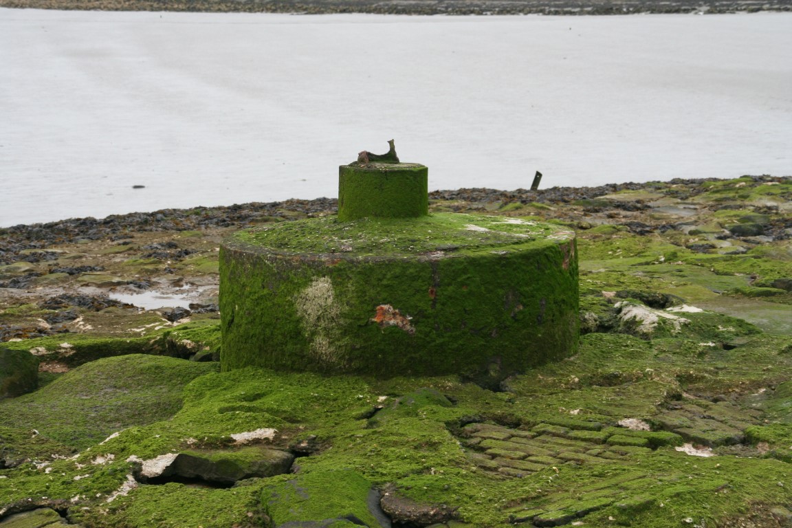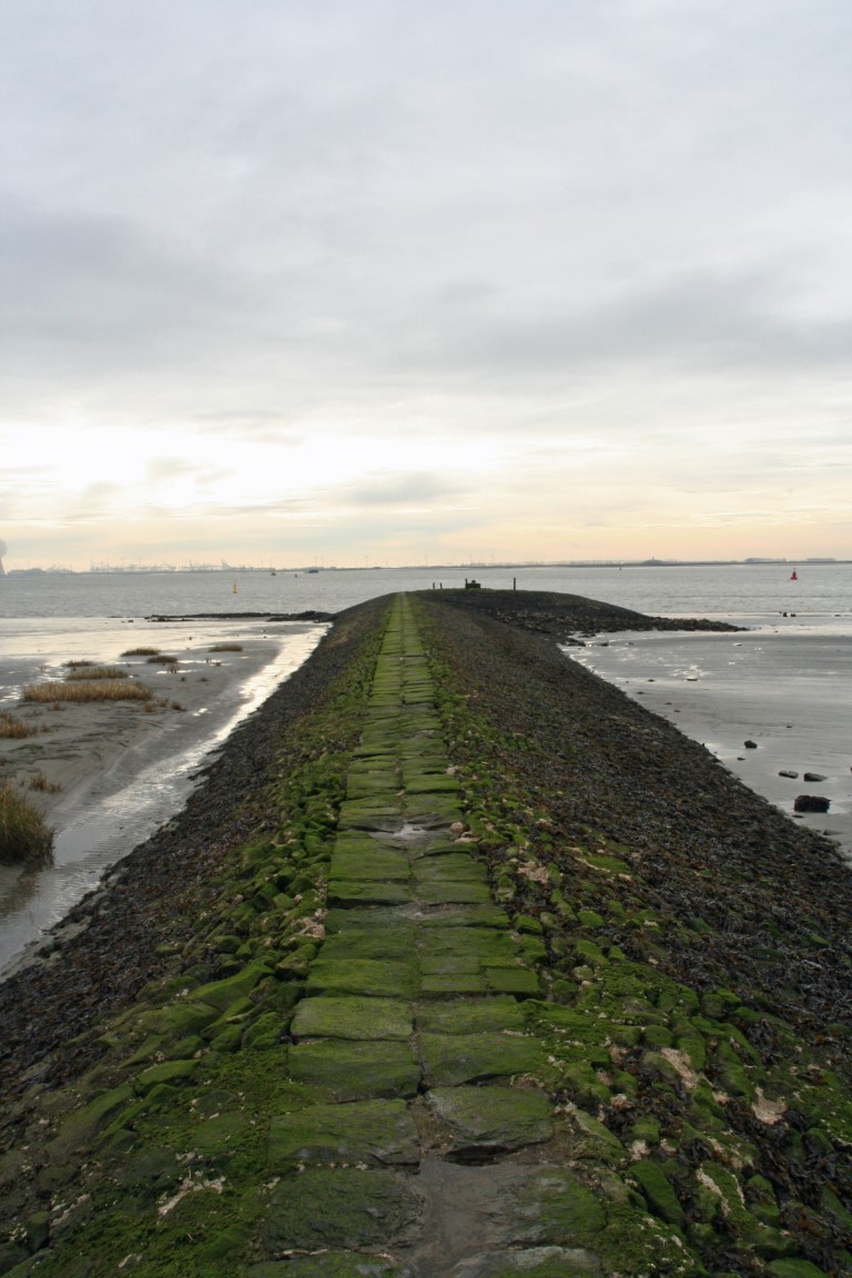 Strekdam van basaltblokken. Op de kop van de dam bevindt zich nog