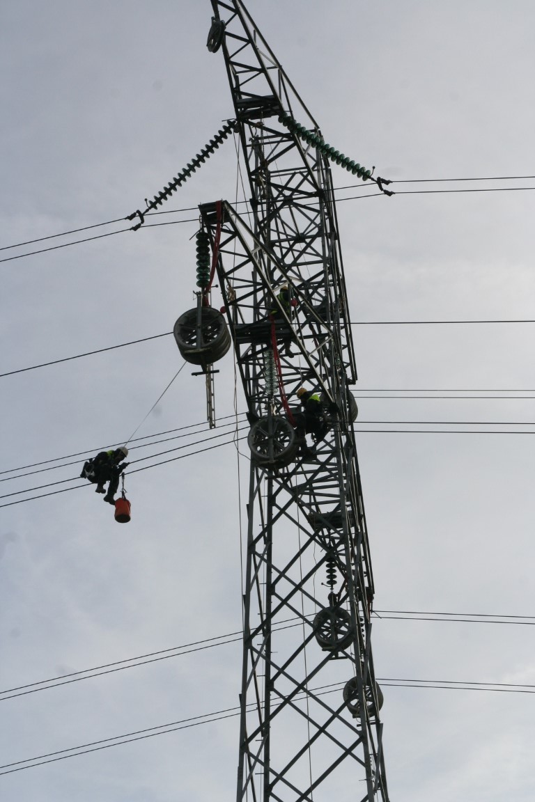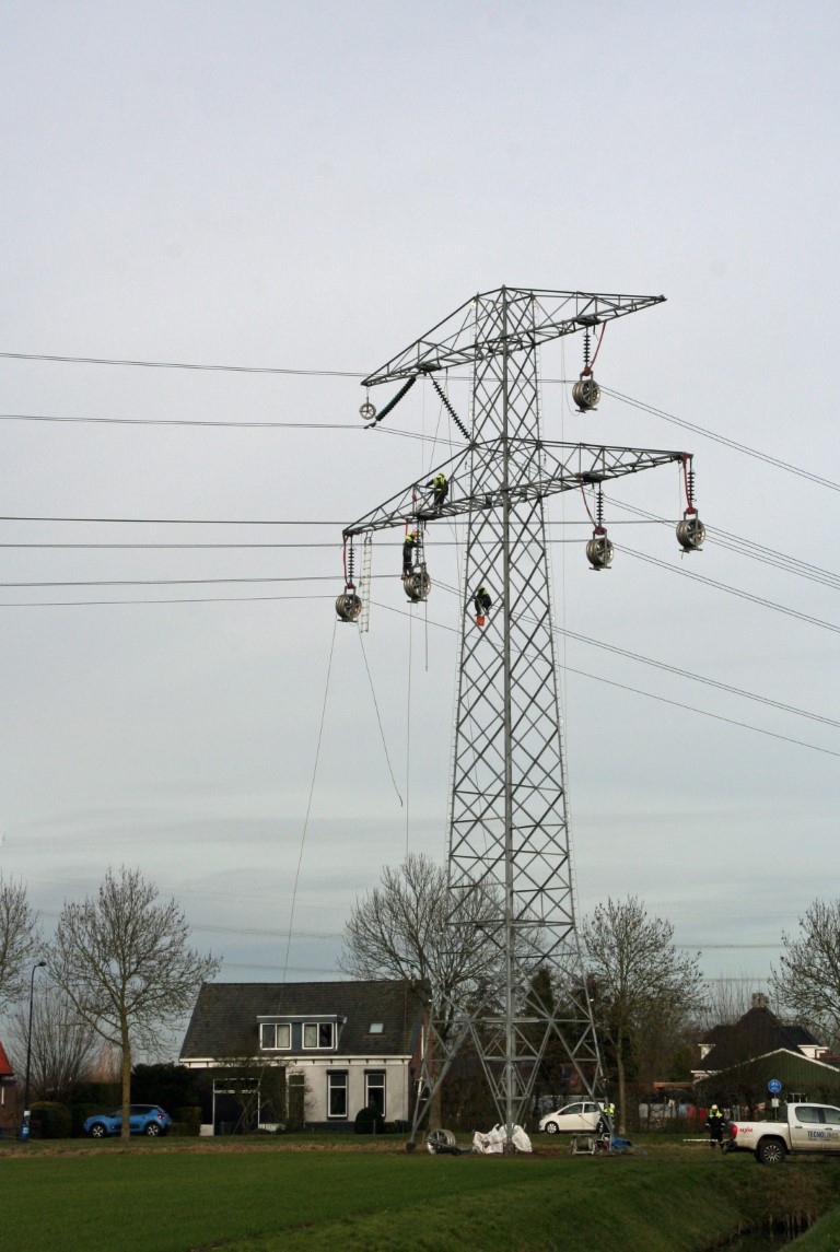 Werkzaamheden aan de hoogspanningsmasten nabij Rilland.