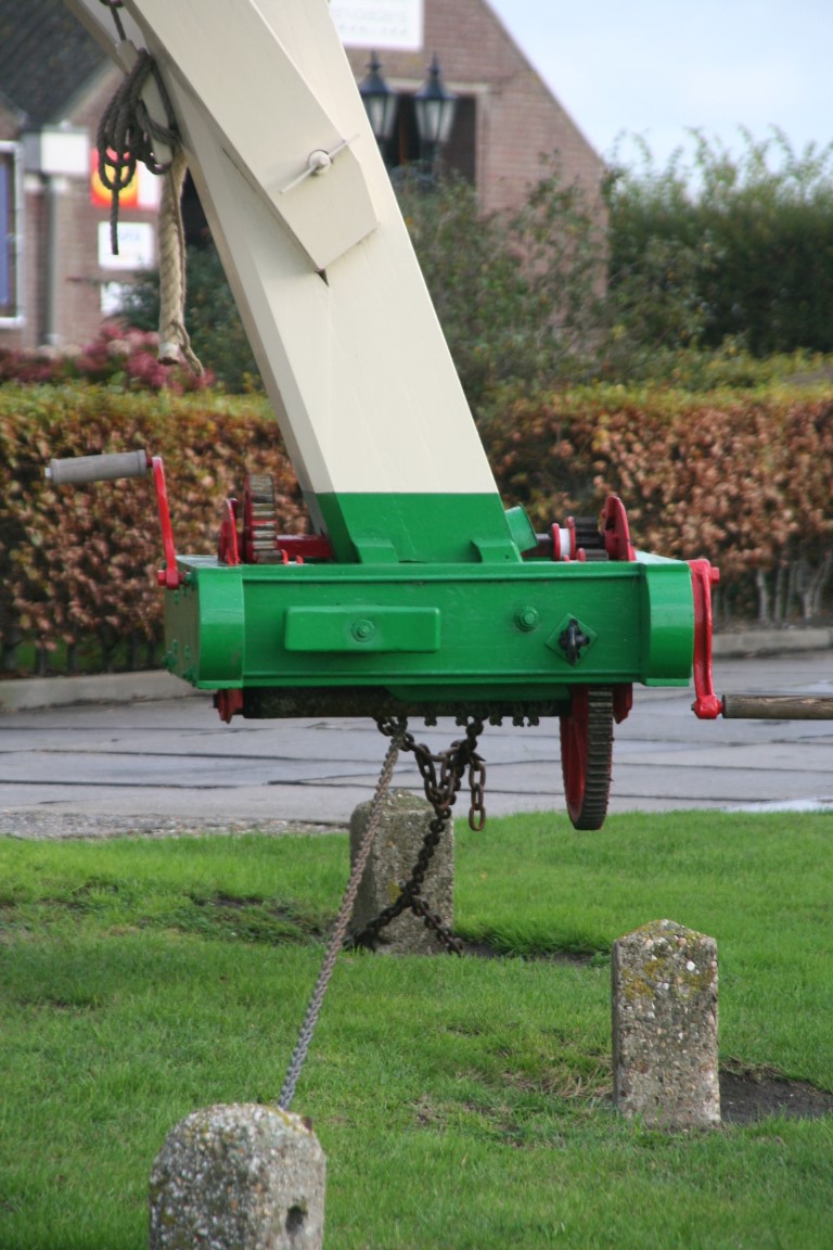 Op de foto recht het mechanisme om de kap te draaien en daardoor de wieken op de wind te zetten. De betonnen palen met de ketting dienen als verankering.