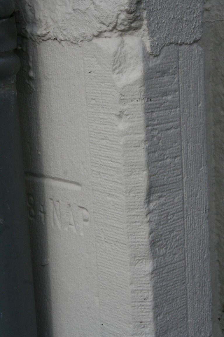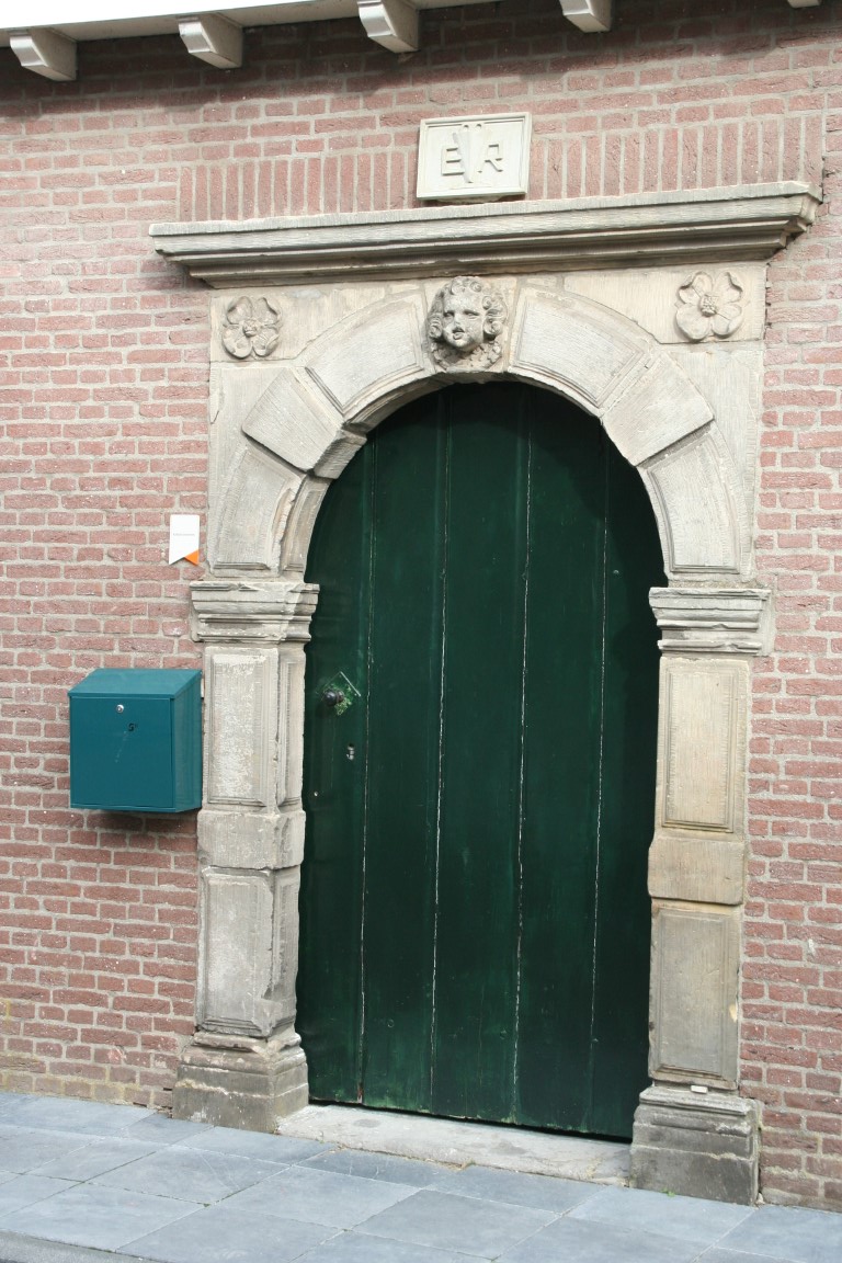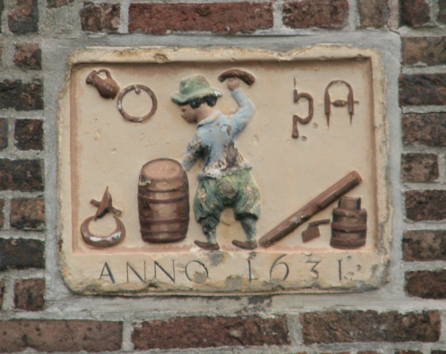 In de kademuur is bovenstaande steen te zien. Het is niet te lezen wat er op deze plaquette staat.