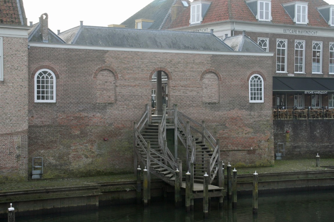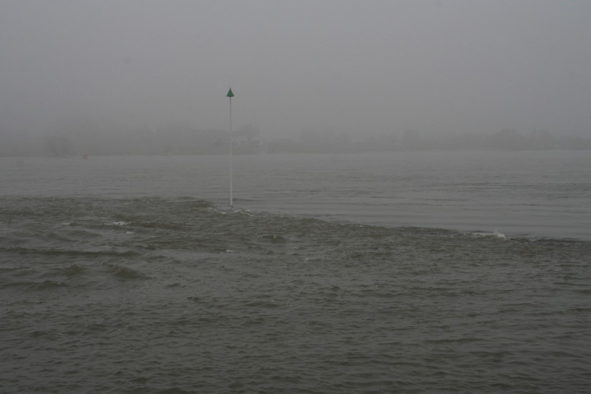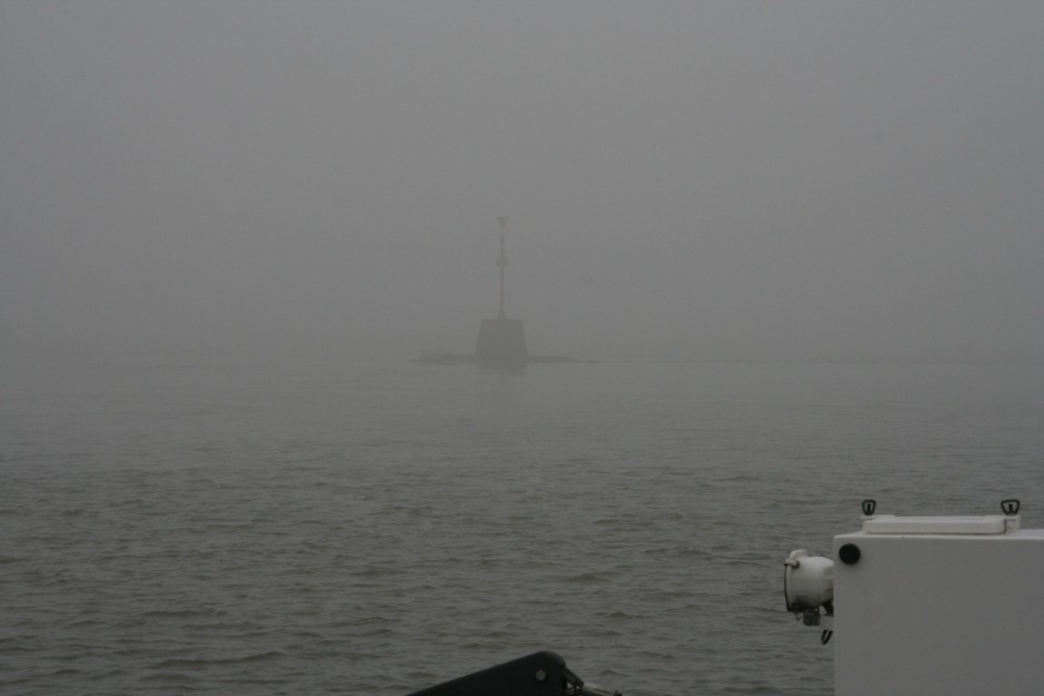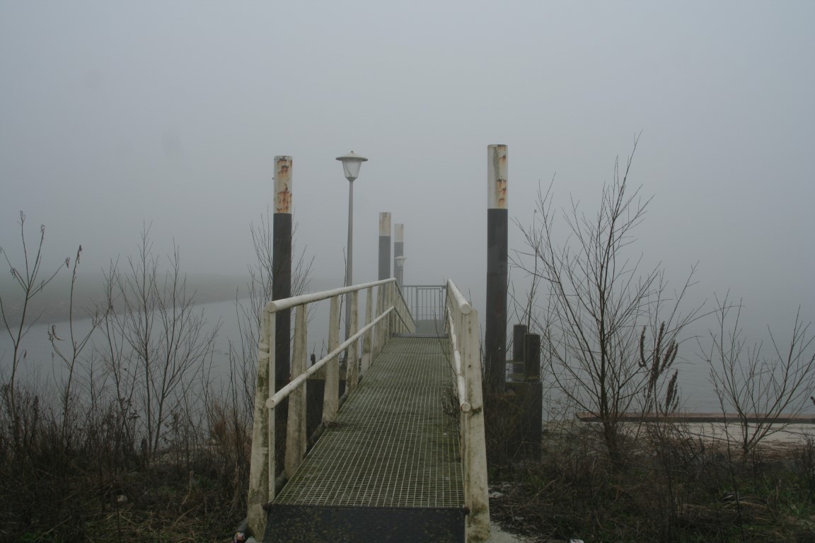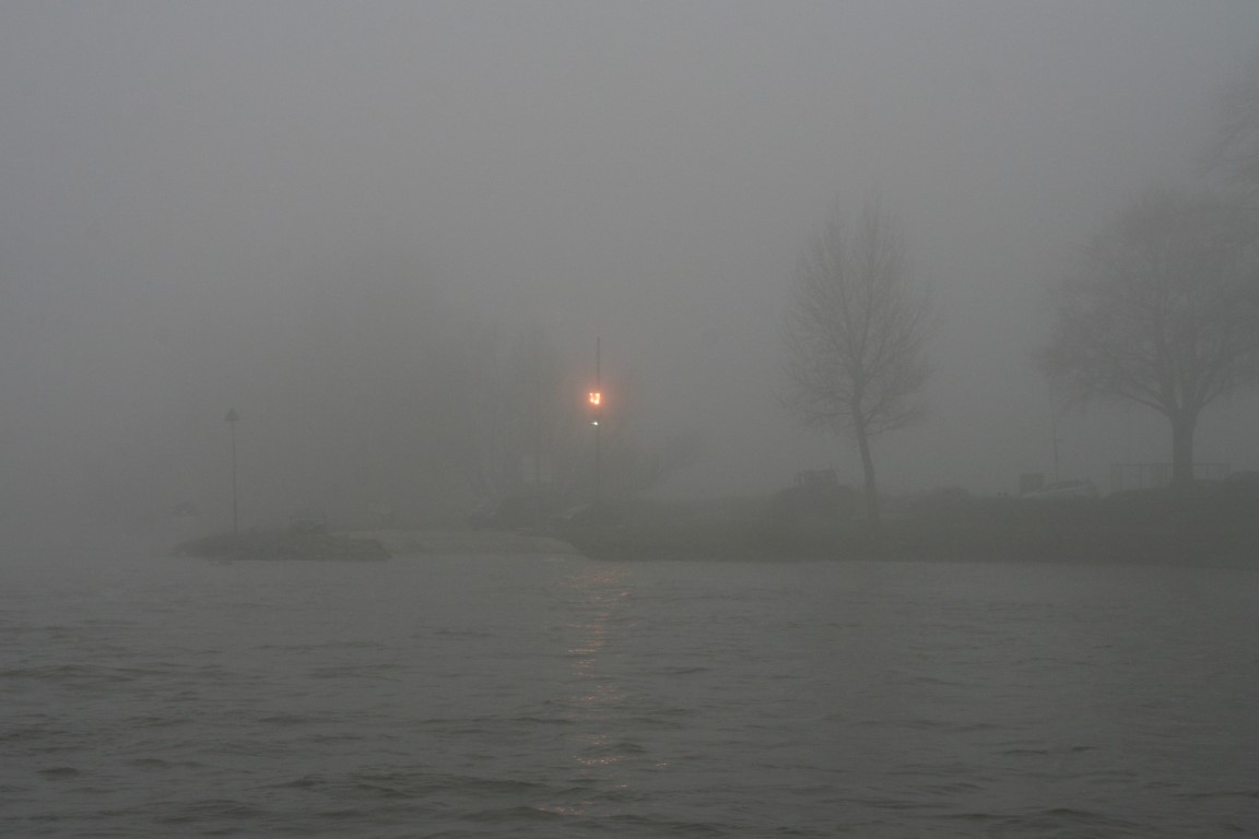 Het zicht op het water geeft een spookachtig beeld. Het havenlicht biedt licht in de duisternis…