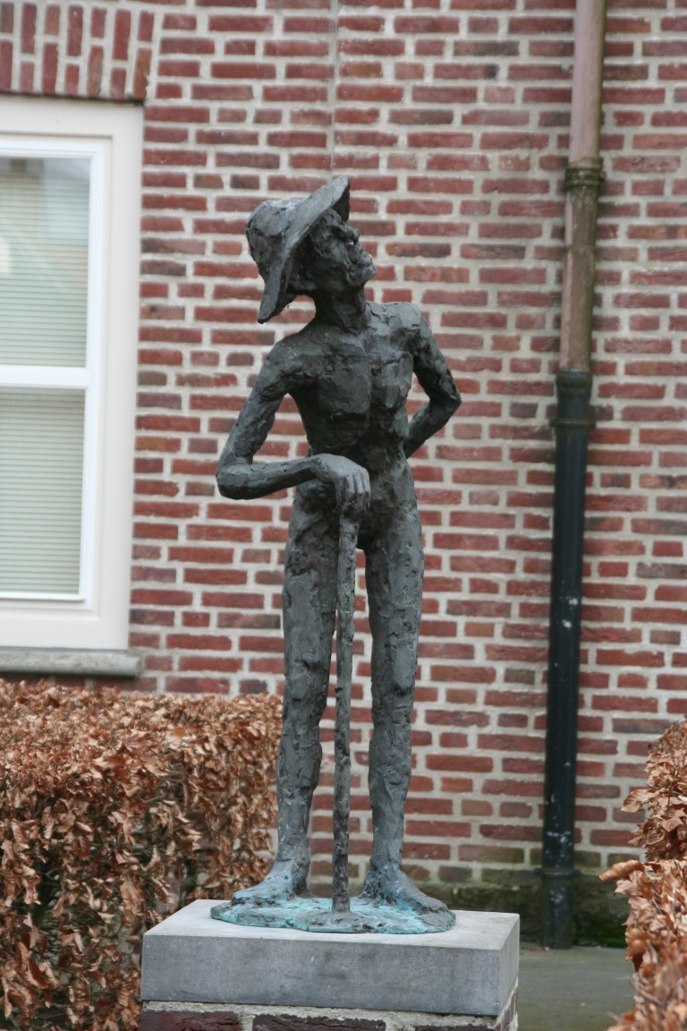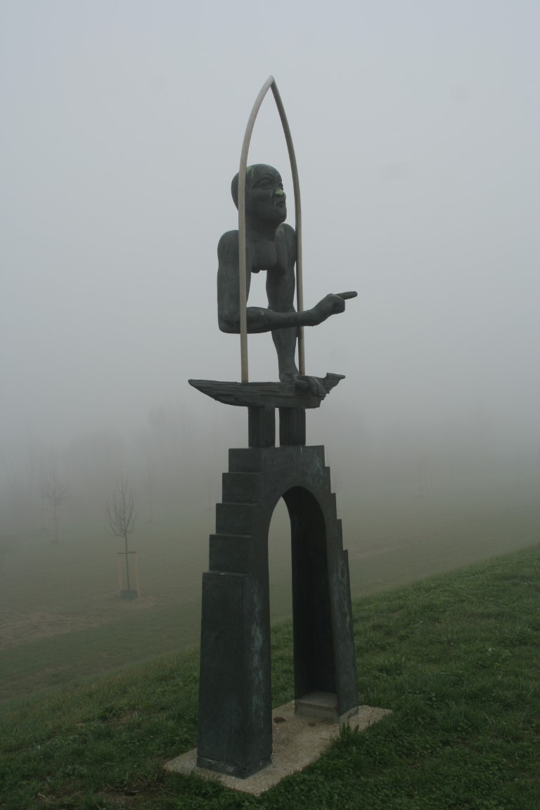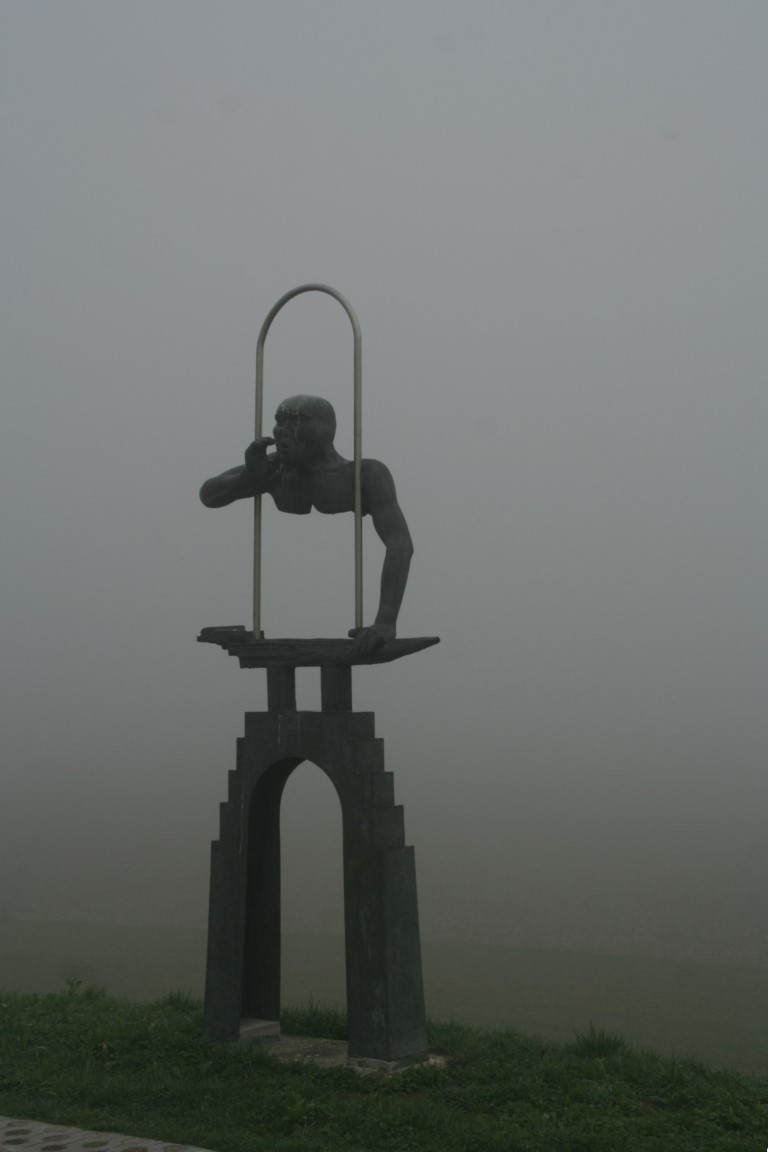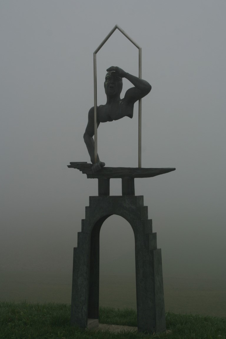 Zeker gezien de omstandigheden een treffende naam voor de beeldengroep! Elk beeld toont het gedeeltelijke bovenlichaam van een man die door een venster kijkt, de meest linker man roept, de tweede kijkt en de derde wijst.