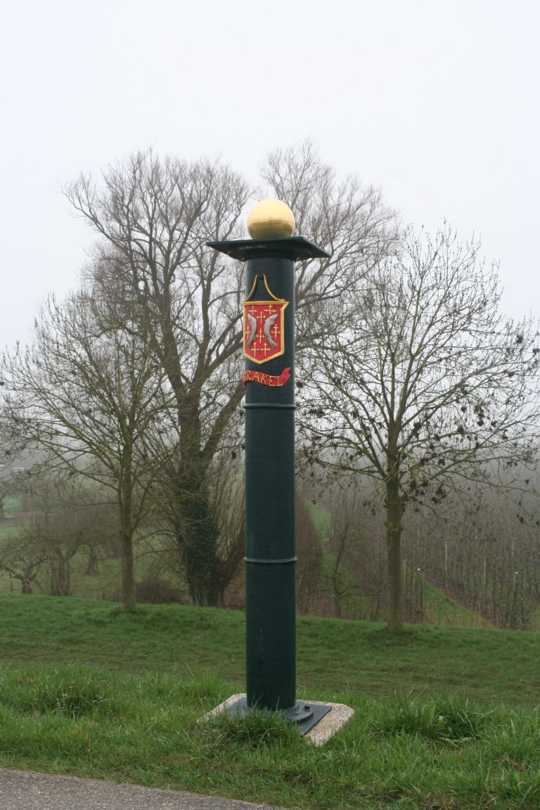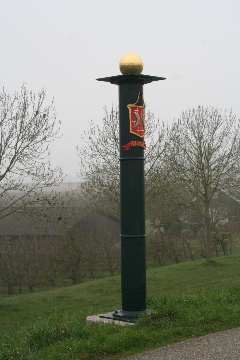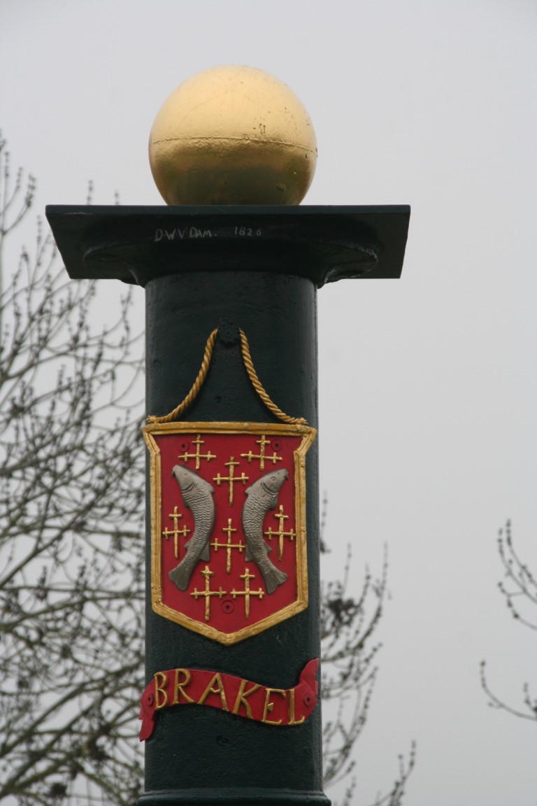De Kaaiepaal, de eeuwenoude ijzeren grenspaal op de Waaldijk tussen Brakel en Zuilichem. De paal toont het wapen van Brakel: twee zalmen. De zalmen in het wapen zouden afkomstig zijn van het familiewapen van Van Altena. Het valt niet met zekerheid te zeggen dat de Van Brakels die tot de eerste helft van de 15e eeuw heer van Brakel waren afstammen van de Van Altena’s. Hoewel de heerlijkheid wel mogelijk een afsplitsing is van het Land van Altena. Opmerkelijk detail: Het gietijzeren middengedeelte heeft aan de achterzijde cijfers die zeer waarschijnlijk op zijn kop staan. Zie foto rechts onder. Navraag bij de gemeente Zaltbommel ontkent echter deze gedachte. De cijfers/letters aan de achterzijde lijken onderdeel van een oudere, oorspronkelijke markering. De leesrichting van deze markeringen is bij oude grenspalen niet altijd direct logisch.