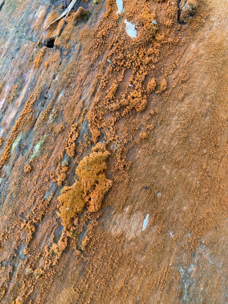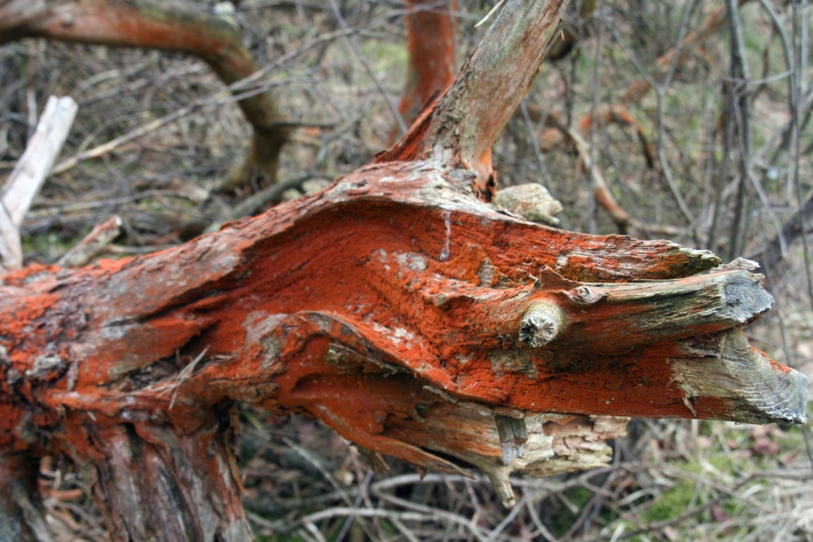 Met enige regelmaat zien we in de bossen bomen met een oranje gekleurde bast. Dit zijn algen, genaamd Trentepholia. Dit is een geslacht van ‘groene algen’ maar bevat erg veel zogenaamde carotenoïde pigmenten en kleurt daardoor oranje.