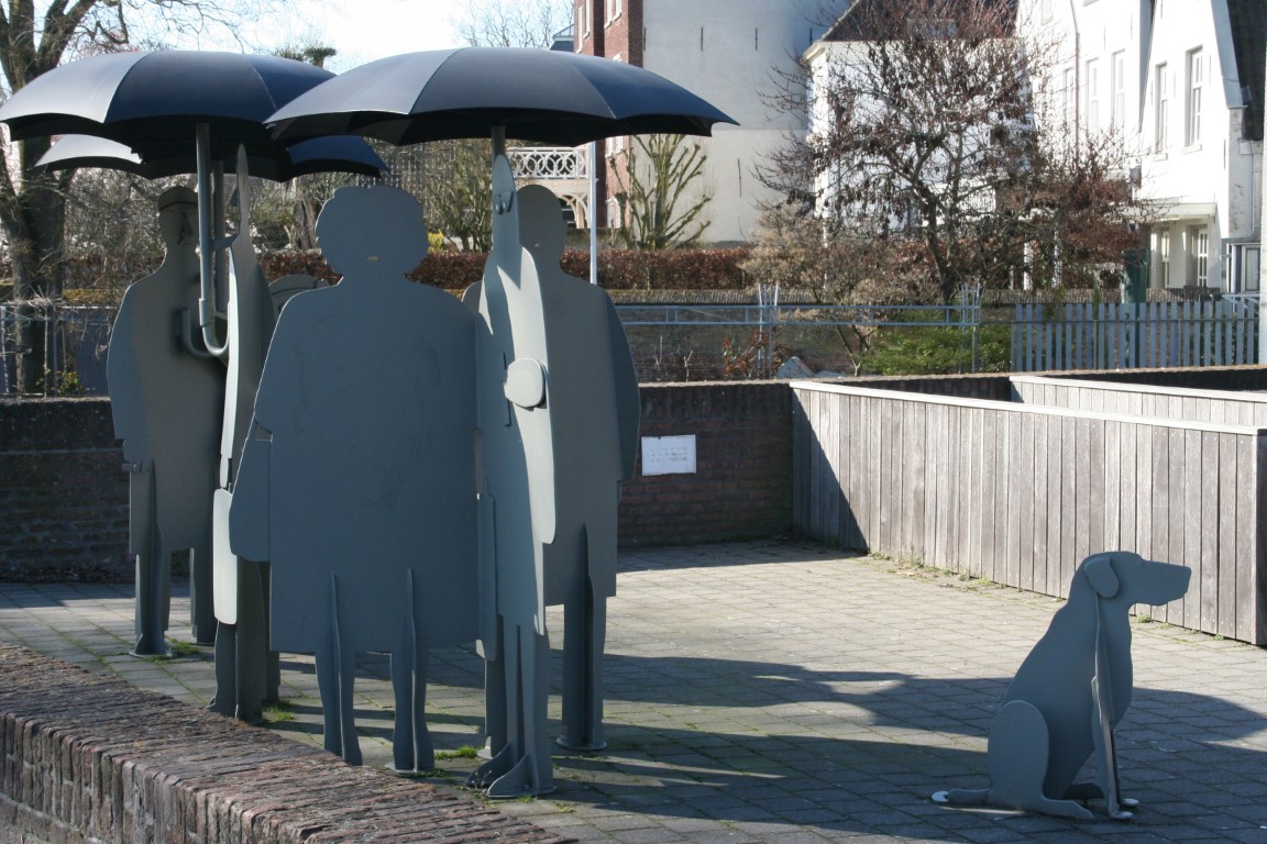Zij stellen zes wachtende mensen voor onder grote paraplu’s en een hond. De schoot van de vrouw vormt een zitplaats, de paraplu’s het dak.