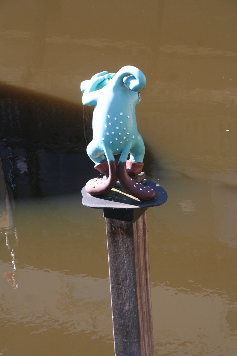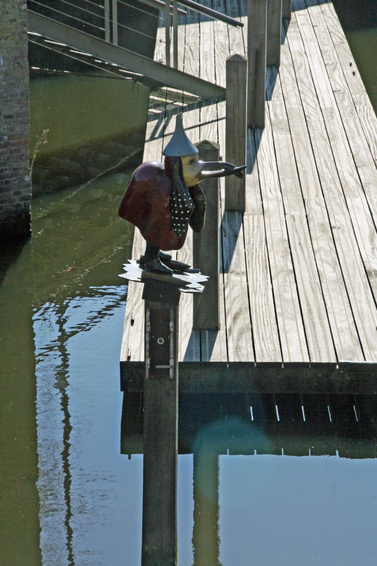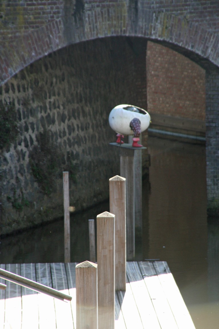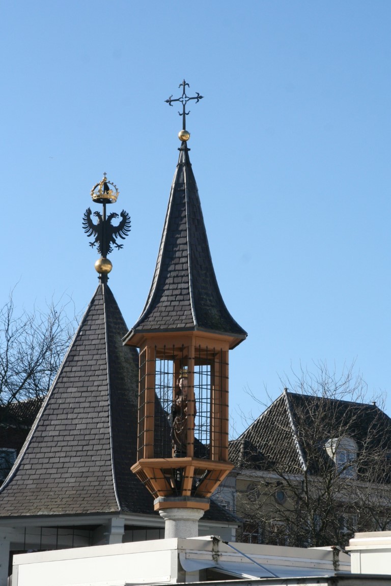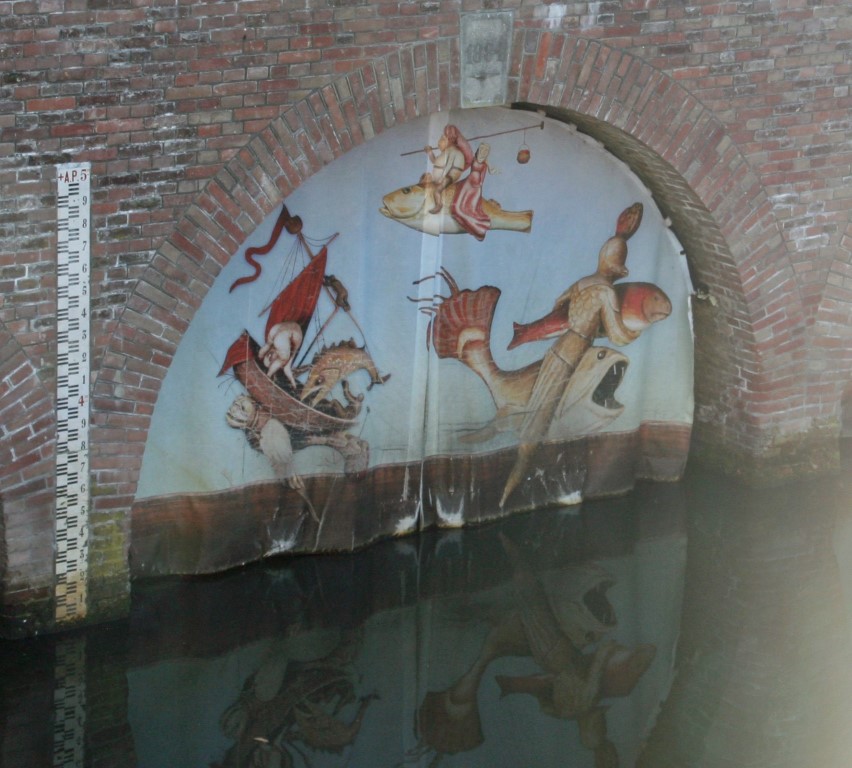 De stadszijde van de waterpoort Groote Hekel. Hier zien we aantal beelden van Jeroen Bosch te weten Het Gedrocht en de Blauwe Fluitvogel.