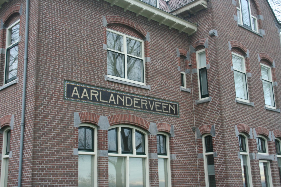 Aarlanderveen lag in het begin van de 20e eeuw aan de spoorlijn Uithoorn – Alphen aan den Rijn als onderdeel van de Haarlemmermeerspoorlijnen. Het station werd geopend op 1 augustus 1915 en gesloten op 1 januari 1936. Het stationsgebouw werd gebouwd in 1913. De Haarlemmermeerspoorlijnen zijn een groep gesloten en opgebroken spoorlijnen in de Haarlemmermeer en het noordelijke gedeelte van het Groene Hart. Hoewel de spoorlijnen onder de naam Haarlemmermeerspoorlijnen bekend staan, liep het overgrote deel van de spoorlijnen niet in de Haarlemmermeer. De belangrijkste stations in het netwerk waren Hoofddorp, Aalsmeer en Uithoorn. De spoorlijnen werden tussen 1912 en 1918 aangelegd door de “Hollandsche Electrische Spoorweg Maatschappij”, anders dan deze naam doet vermoeden hebben er alleen nooit elektrische treinen gereden. Het reizigersverkeer op deze lijnen was van korte duur: de meeste lijnen werden in de jaren ’30 weer gesloten, maar bleven soms wel in gebruik voor goederenvervoer.