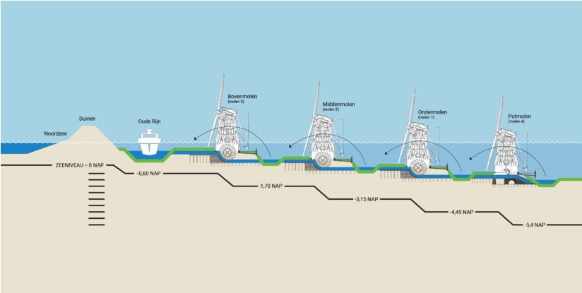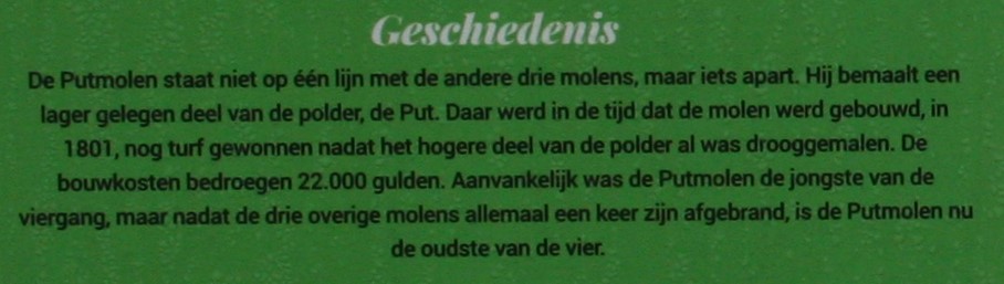Een molengang is een rijtje molens, een gang, die samenwerken om trapsgewijs overtollig water uit een laaggelegen polder omhoog te malen en uiteindelijk in een rivier te spuien. In Aarlanderveen werken vier molens samen: een viergang. Elke molen doet zijn deel van het werk en ‘tilt’ het water een stukje op, zo’n meter tot anderhalve meter. In totaal moet een hoogteverschil van meer dan vijf meter worden overbrugd. De Putmolen, die het diepst ligt, brengt het water omhoog met een vijzel, de andere doen dat met schepraderen. Via de laatste, de Bovenmolen, gaat het water de Oude Rijn in. De Molenviergang Aarlanderveen is de enige nog werkende molengang in de wereld. De polder waar deze molens staan ligt en het water wegmalen ligt maar liefst 5,4 meter onder Zeeniveau (NAP).
