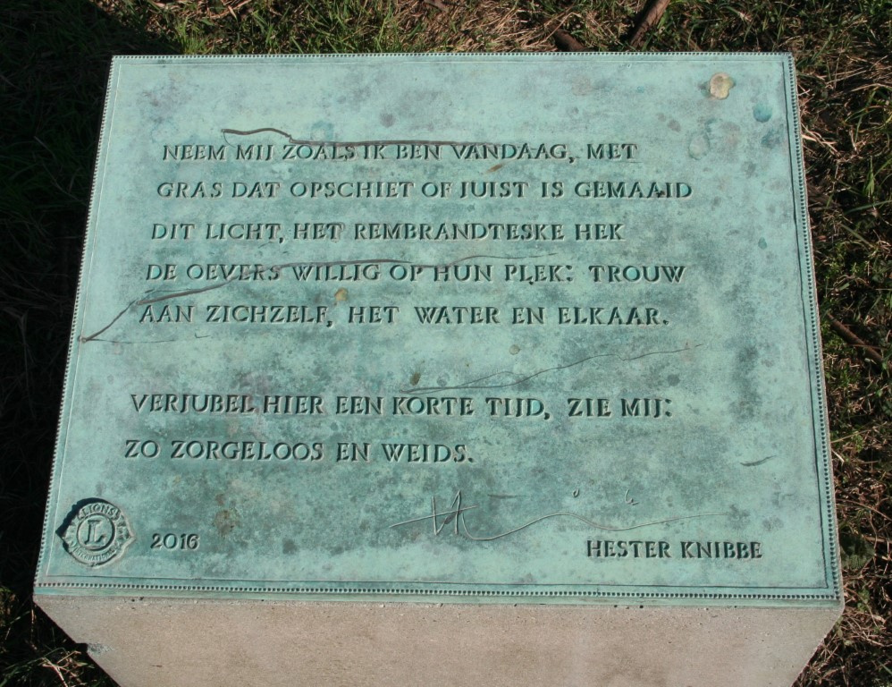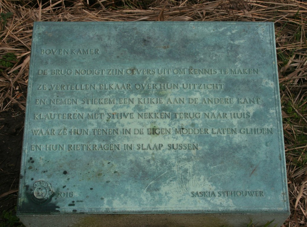 Het gedicht bij de Kikkerbrug in Groot-Ammers maakt deel uit van het project “Dichterbij de Polder”. “Dichter bij de Polder” is een poëzieproject en boek dat de schoonheid van het Alblasserwaardse landschap vastlegt, vaak in relatie tot de iconische molens, weilanden en sloten. Het fungeert als een literaire ontdekkingsreis door deze streek en dient als afsluiting van een specifiek cultuurhistorisch project.