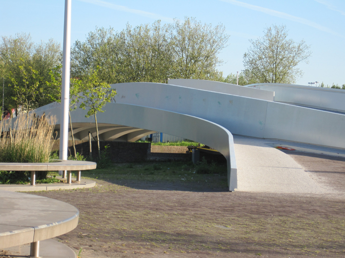 De witte brug heeft het van de (vloeiende) golfvorm in zich. Opvallend is dat het voetpad aan de westkant halverwege zich van de hoofdconstructie afsplitst om later weer samen te vloeien. De architect wilde zo ervoor zorgen dat de voetganger meer aandacht kreeg voor de omgeving, dan puur voor de brug en er zou meer binding zijn met het onderliggende water. Dat voetpad is los van de brug geconstrueerd, want het heeft ook een ander hellingspercentage. De brug is genoemd naar de hoeve “Na-Druk-Geluk” (na gedane arbeid is het goed rusten) die hier tot de eindjaren twintig stond.