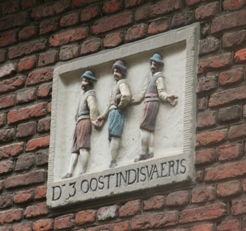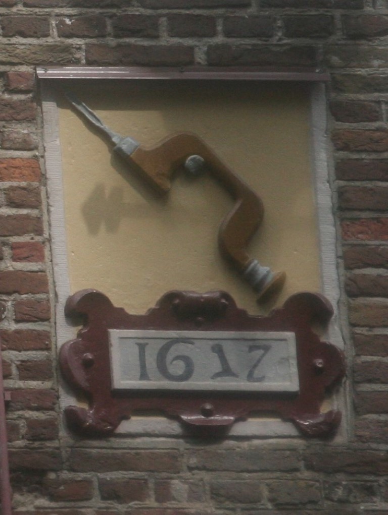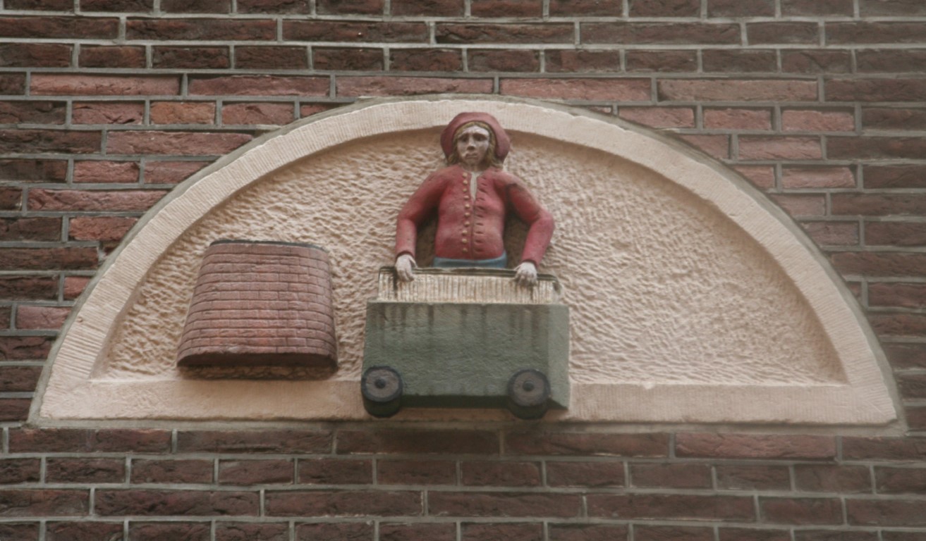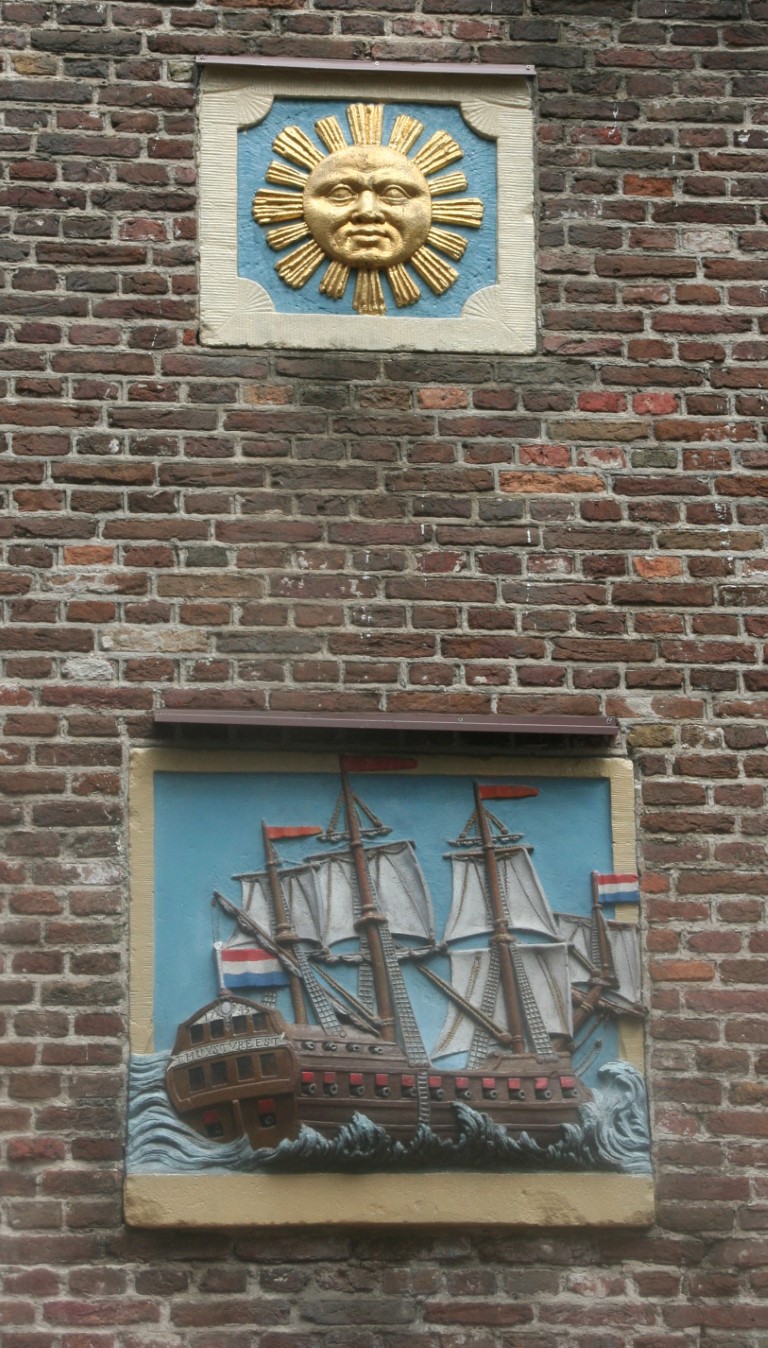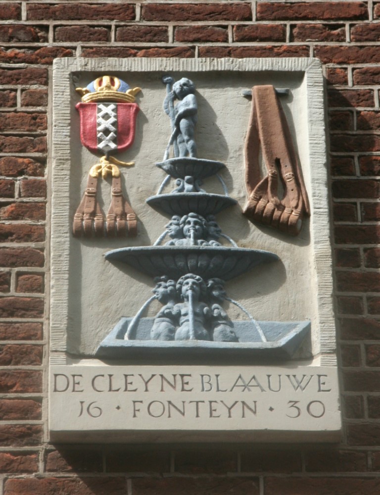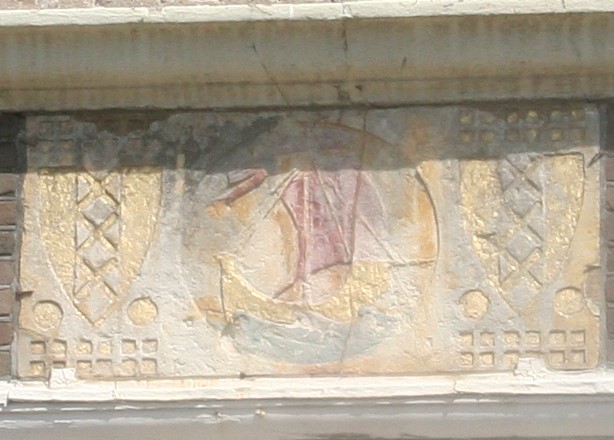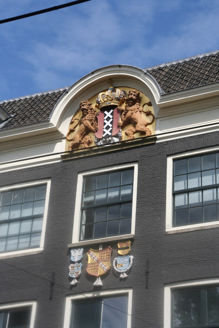 Amsterdam is rijk aan gevelstenen. Rechtsonder het wapen van Amsterdam en de wapens van de bestuursleden van een schuttersgilde.