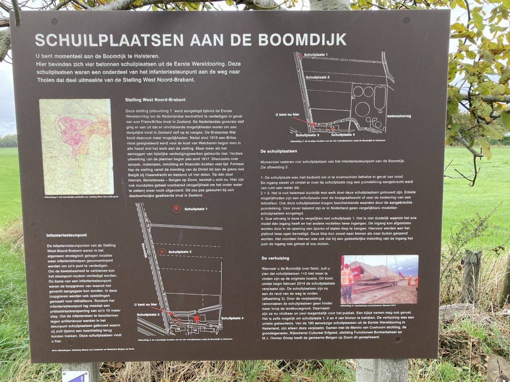 De restanten van een vestingwerk, de verdedigingslinie aan de Boomdijk achter de voormalige kreek Verkorting, daterende uit de Eerste Wereldoorlog, met vroege gewapend betonnen schuilplaatsen. Deze schuilplaatsen maakten deel uit van een infanteriesteunpunt dat de weg Tholen – Halsteren verdedigde tegen een Britse inval via Zeeland. De voorgelegen polders waren voorbereid voor inundatie. Ten zuiden en ten noorden van dit steunpunt lagen nog een aantal van dit soort steunpunten.