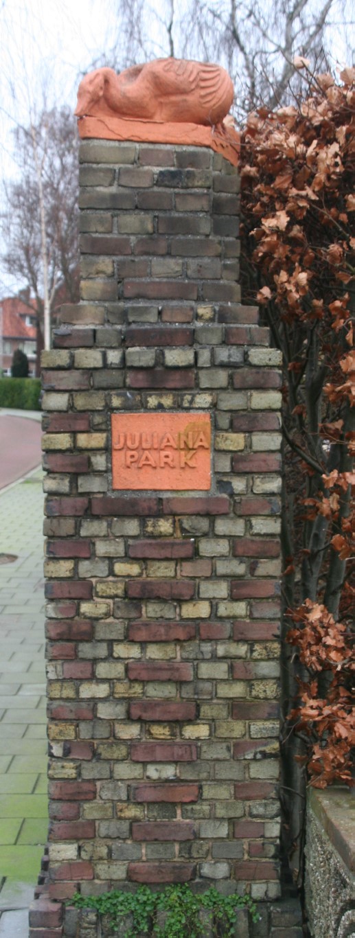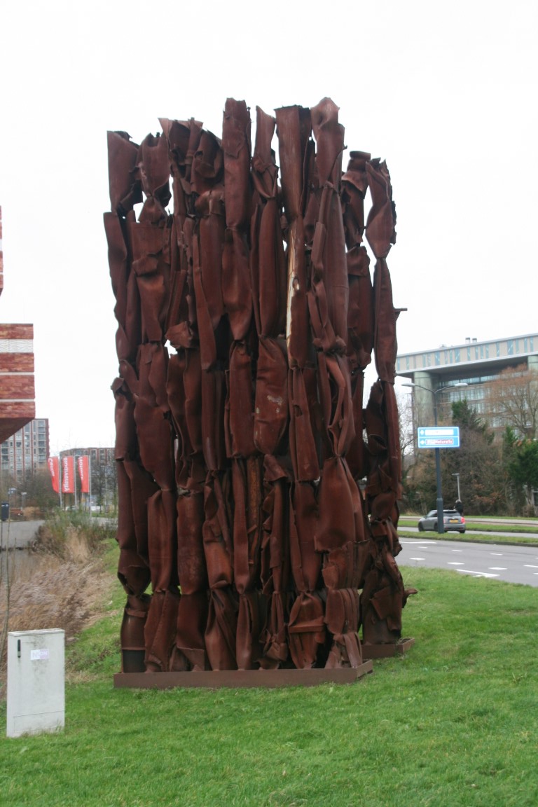 ‘Het beeld is samengesteld uit twee delen. Het ene is een gesloten, zichzelf beschermend gedeelte. Het andere is een open, actief en aanvallend gedeelte. Deze twee delen lopen in elkaar over en vullen elkaar aan. Zo symboliseren zij het verzet. De horizontale richting van het beeld wordt bekrachtigd door de verticale kolommen. Zo wordt een relatie gelegd tussen de open ruimte (het bos van Wijckerslooth) en de ruimte binnen het monument.’