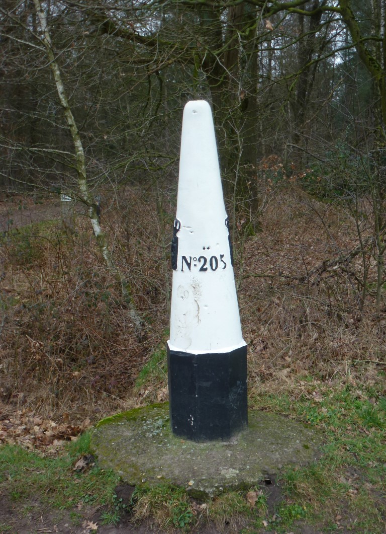 Grenspaal 205 staat op een viersprong. Opmerkelijk is dat de kroon ontbreekt en de witte kleur.