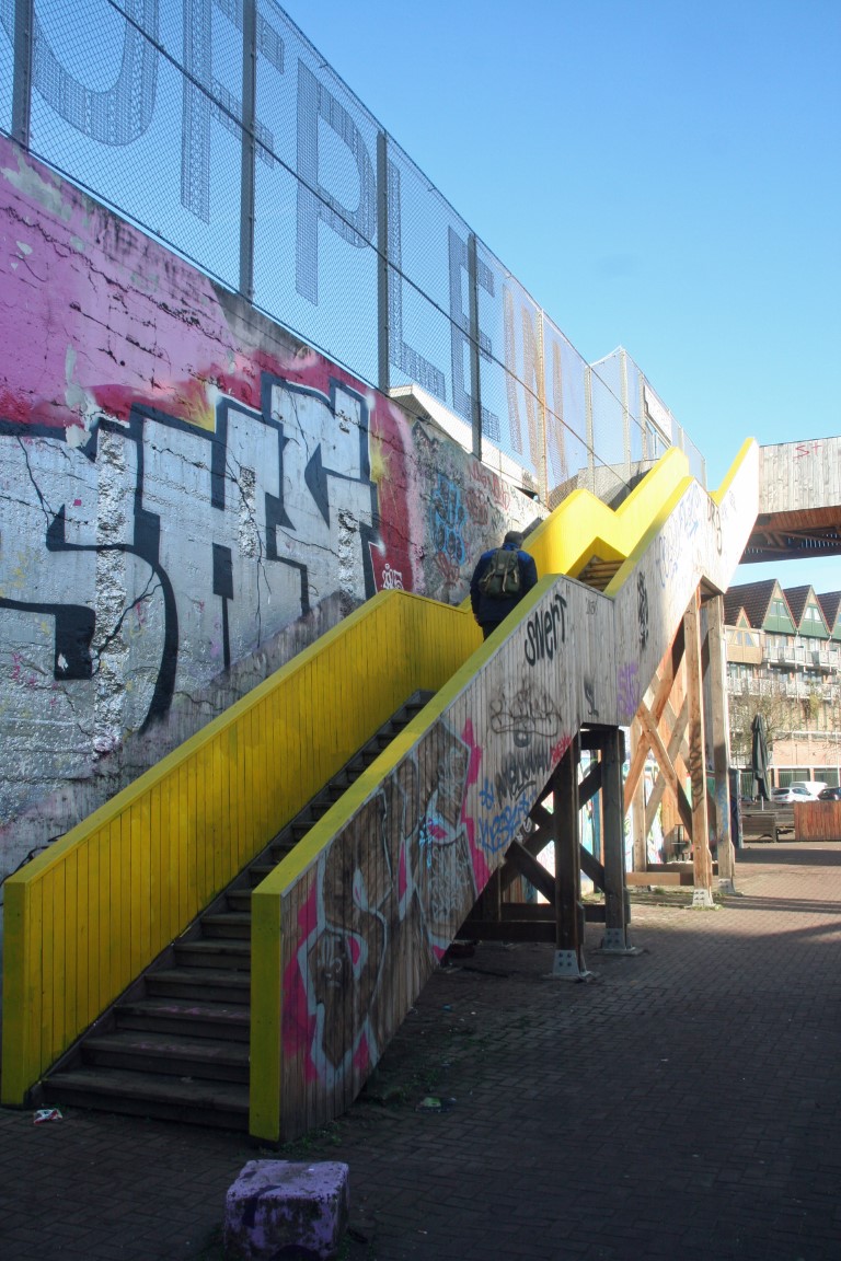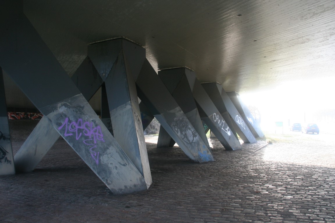 Het is het bruggedicht ‘.broodkruim‘ van Dean Bowen dat door kunstenaarsduo Bier en Brood vertaald is naar een sterk staaltje street art. Een gedicht over hoe mensen, net als de stad, steeds nieuwe versies van zichzelf bouwen. De Beukelsbrug ligt naast de DHS-brug