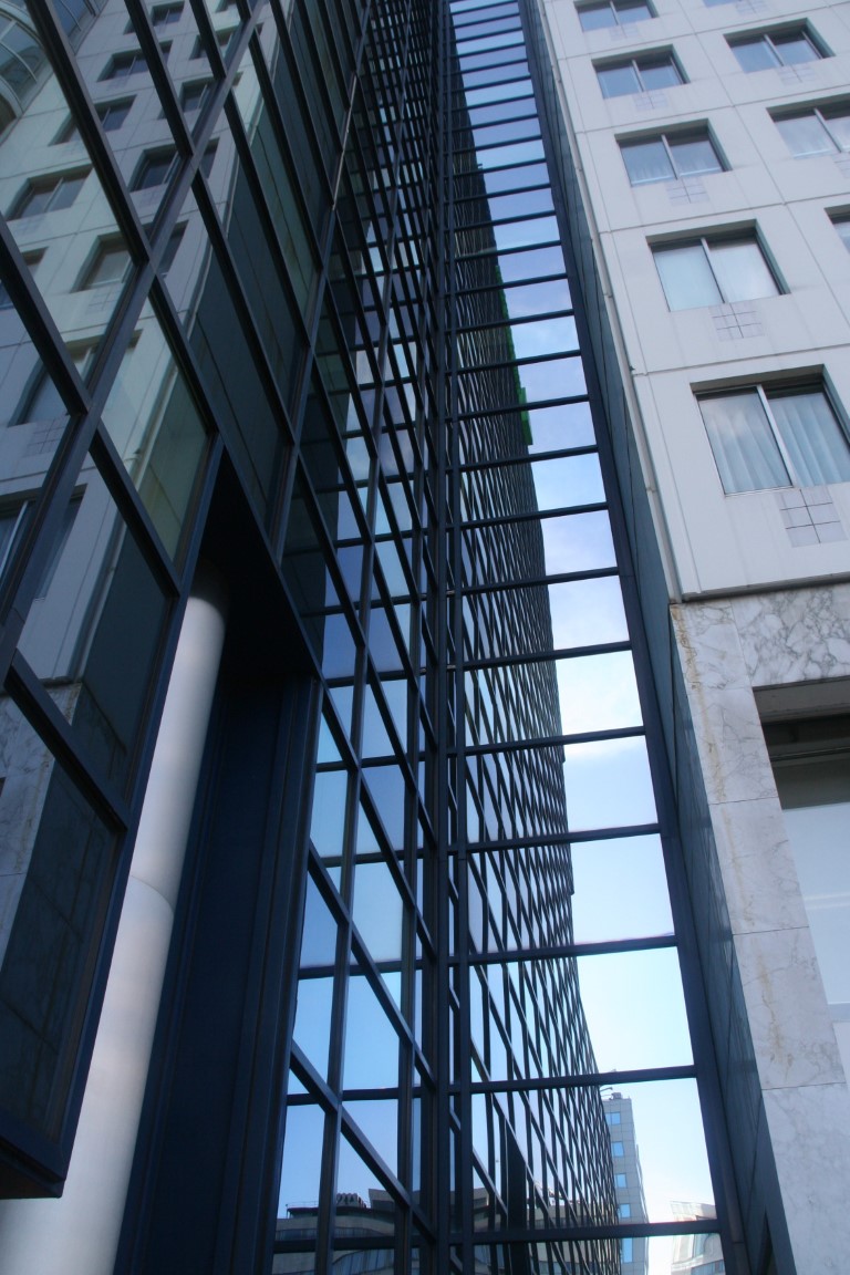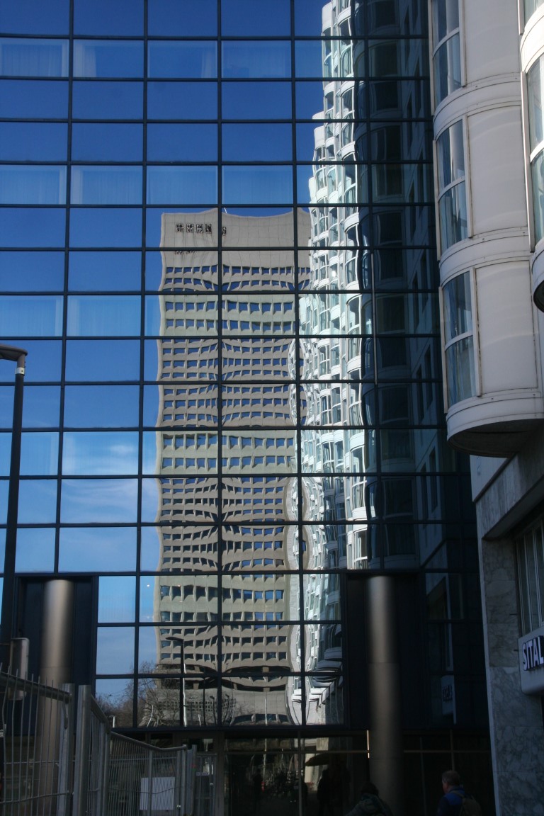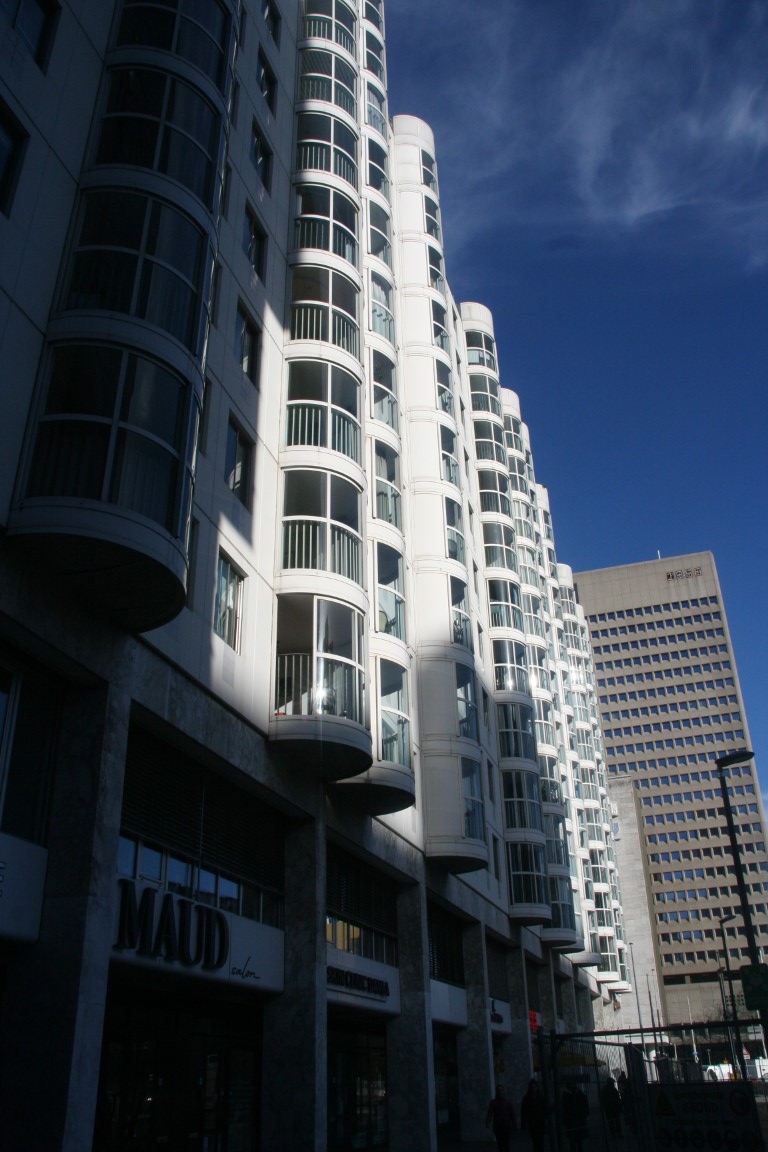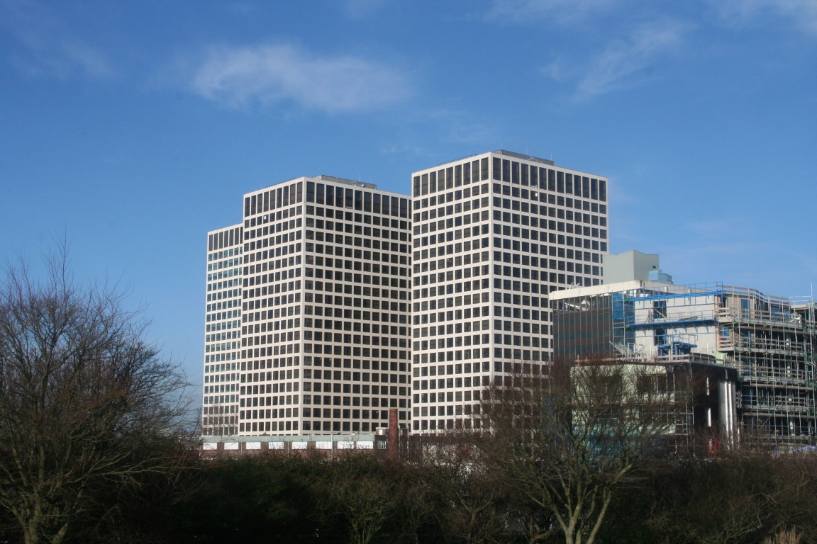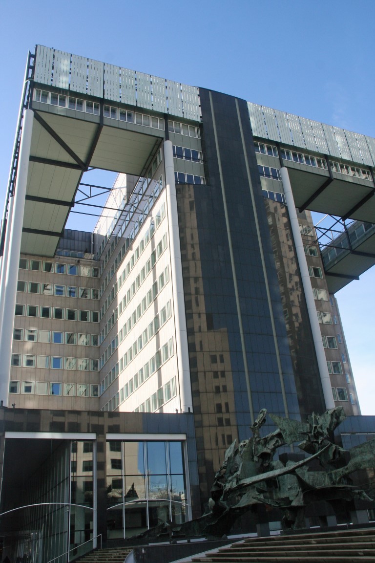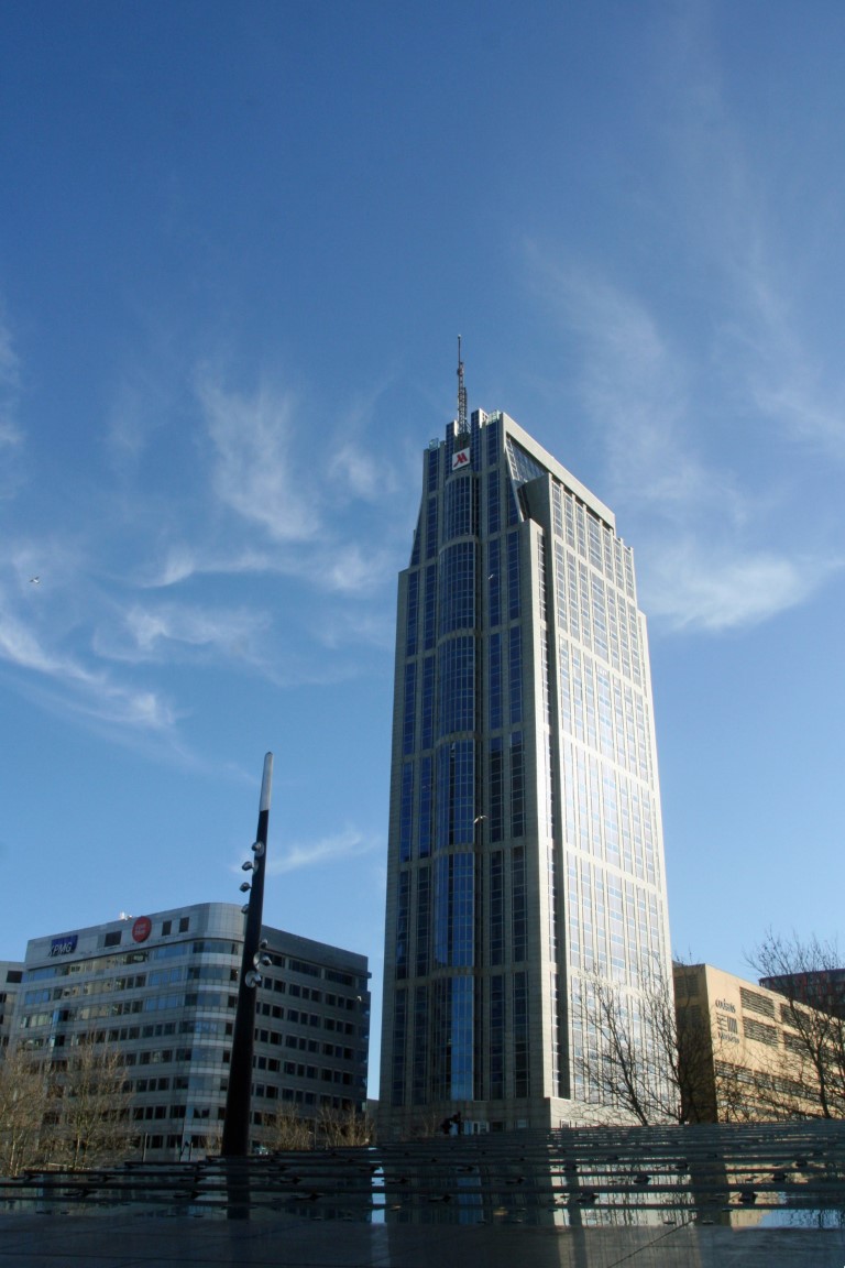 De 132 meter hoge Millenniumtoren tegenover het station.