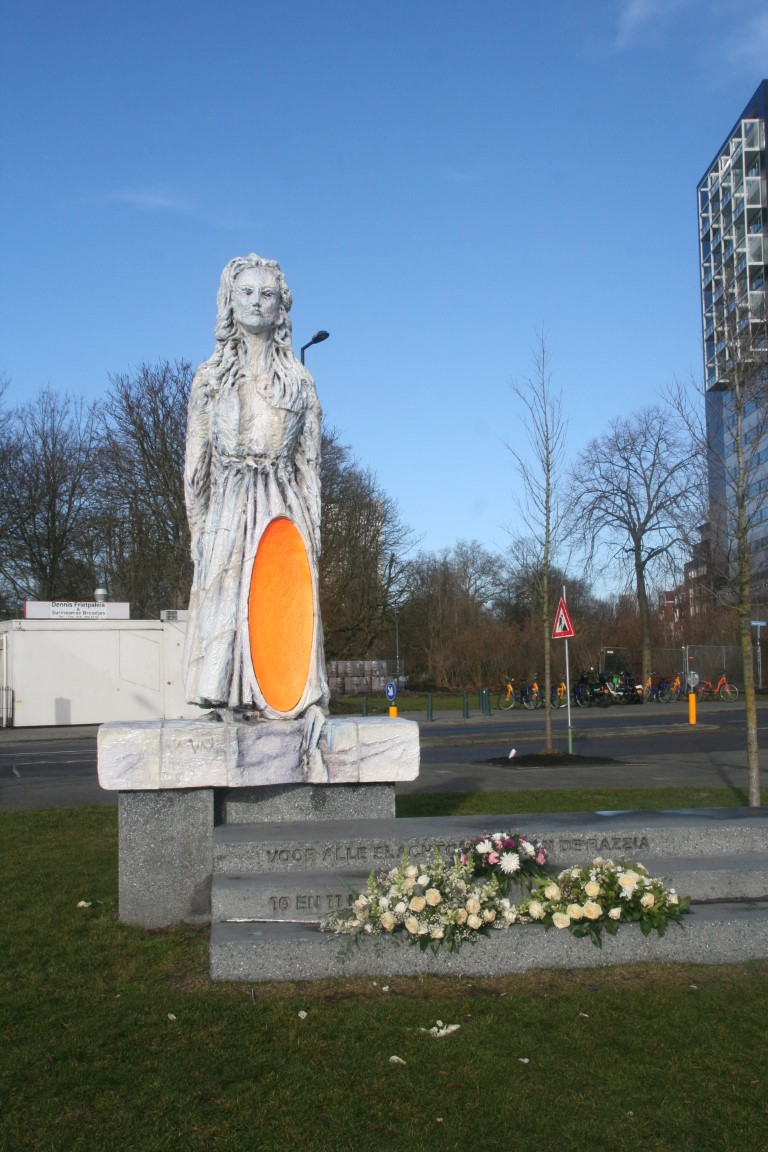 Het Razzia Monument is opgericht ter nagedachtenis aan de 52.000 mannen en jongens uit Rotterdam en Schiedam die op 10 en 11 november 1944 door de Duitse bezetter werden opgepakt en weggevoerd om dwangarbeid te verrichten en aan degenen die zij achterlieten. Je ziet een meer dan levensgrote staande vrouw en een knielende man van keramiek. Ze zijn gescheiden van elkaar en de plekken waar de beelden van elkaar losgesneden zijn worden met een bijna fluorescerend oranje kleur geaccentueerd. Dit staat symbool voor de wonden die de razzia achterlaat. De tekst op het monument luidt: ”Voor alle slachtoffers van de razzia 10 en 11 november 1944”.