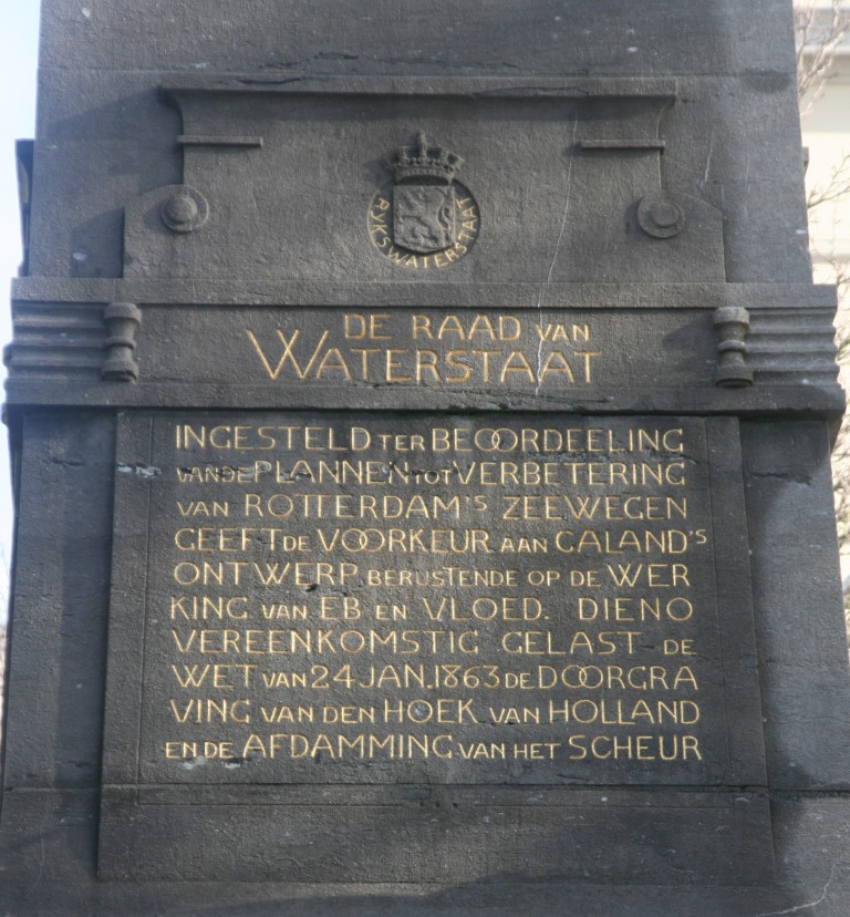 Het monument is gewijd aan Pieter Caland, de schepper van de Nieuwe Waterweg (1872), de broodnodige directe verbinding met zee. Het monument is een ontwerp uit 1906. Het gedenkteken bestaat uit een monumentale fontein waarin een vierkante hoge onderbouw een obelisk draagt die door een bolvormige motief wordt bekroond. Hierop staat een gevleugelde vrouwenfiguur – de genius (beschermengel) van Rotterdam – die de Mercuriusstaf (handel) hooghoudt. Hieronder staan de wapens van stad en provincie, die herinneren aan de loop van de Waterweg. Aan de voorzijde staat een gedenksteen met het bronzen profiel van Caland, door een lauwerkrans en toepasselijk opschrift omgeven. Toepasselijke opschriften bevinden zich ook op de gedenktafels die tegen de drie overige zijden zijn geplaatst. Twee bronzen kinderfiguren symboliseren de handel en nijverheid van Rotterdam als handelsplaats.