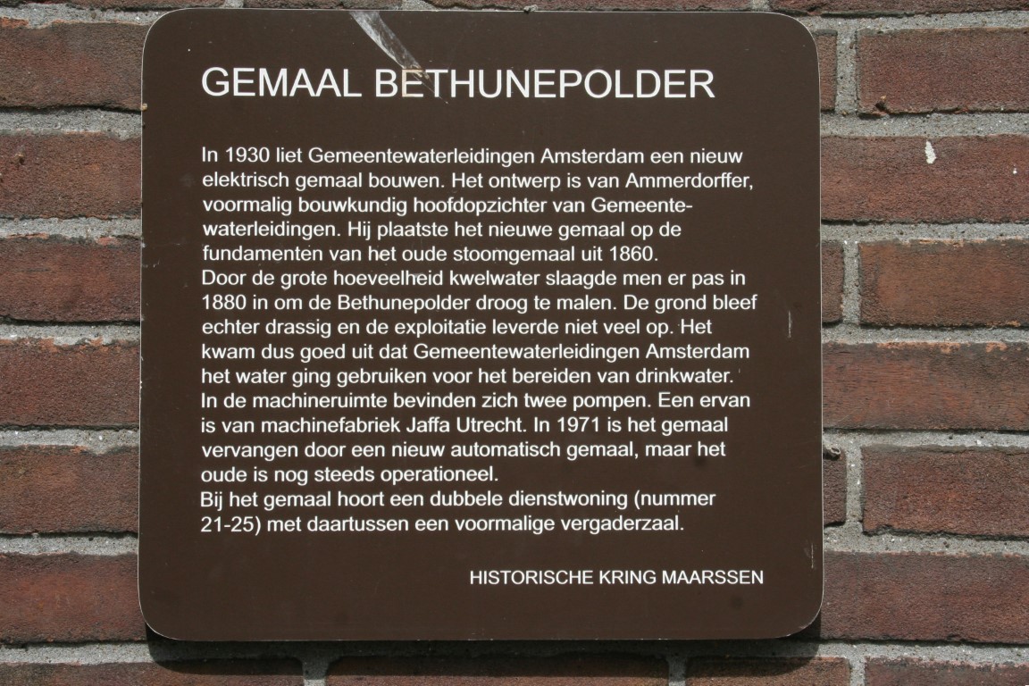 In 1860 werd een stoomgemaal gebouwd. Door de bijzonder grote hoeveelheid kwelwater slaagde men er pas 20 jaar later in de polder enigszins droog te krijgen. Tot een goed winstgevende exploitatie kwam het niet omdat de grond te drassig bleef. Gaandeweg kreeg de polder vervolgens een functie in de drinkwatervoorziening van Amsterdam. De Gemeentewaterleidingen Amsterdam liet daarin dit elektrische gemaal bouwen op de oude fundamenten van het stoomgemaal. Zo’n 20 tot 25 miljoen m3 water pompte dit gemaal jaarlijks weg uit de 535 hectare tellende Bethunepolder die zo’n 3 meter onder NAP ligt. In 1971 is voor de bemaling een automatisch gemaal in dienst gekomen. Sindsdien fungeert het oude gemaal als stand-by. De gemalen voorzien in ongeveer een derde van het Amsterdamse drinkwater.