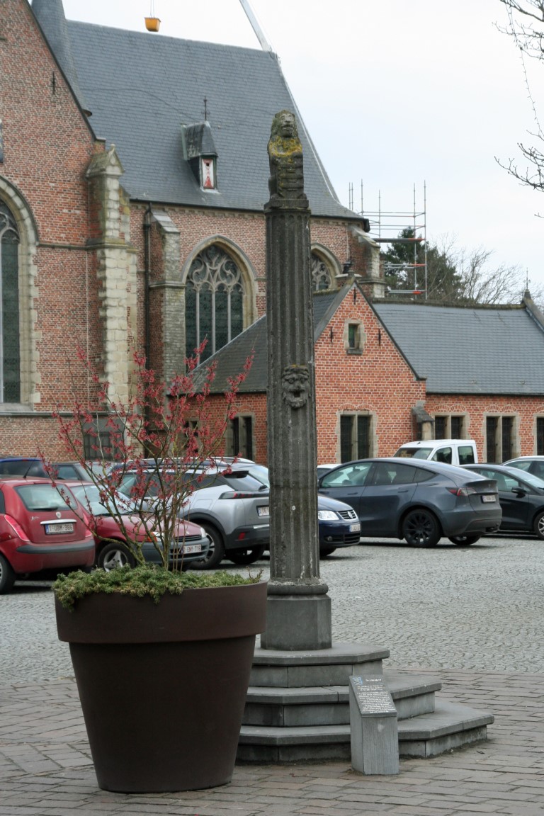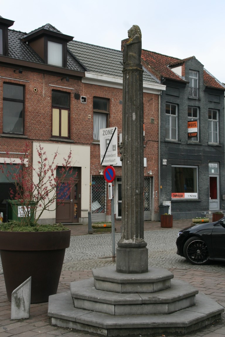 Deze zuil is geribd met centraal een leeuwenkop en rust op drie achthoekige treden en een voetstuk. Aan deze leeuwenkop was vroeger een ijzeren ring en halsband bevestigd waaraan de veroordeelde aan de bespotting van het volk werd blootgesteld. Bovenop werd een leeuw aangebracht die het wapenschild van Stekene (drie gouden stekelbaarsjes in een blauwe plas) draagt.