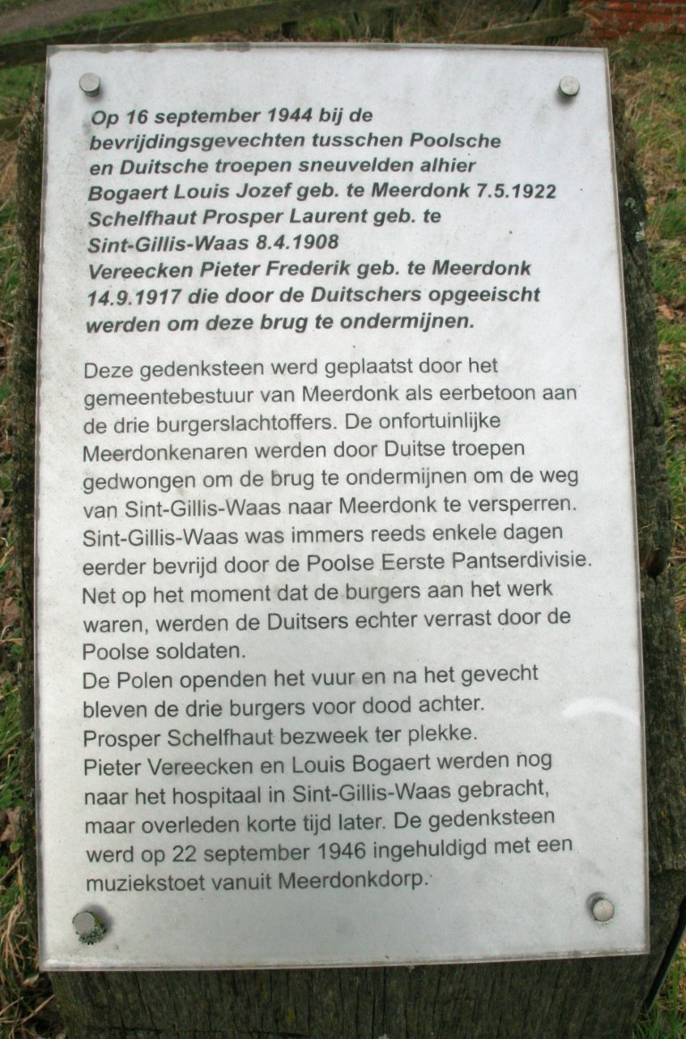 Op de zijkanten staan de namen van de slachtoffers met plaats en datum van overlijden. Een belangrijke gebeurtenis tijdens de eerste wereldoorlog in Meerdonk was de moord op de Duitse politieagent Kipnase in 1918. De dader was onbekend en enkele inwoners van Meerdonk en St. Gillis-Waas werden toen opgesloten.