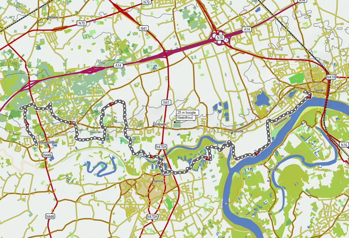 De route gaat verder richting Temse met aan de linkerkant de Potpolder Tielrode en aan de rechterkant de Schelde. De Durme is overgegaan in de de Schelde.