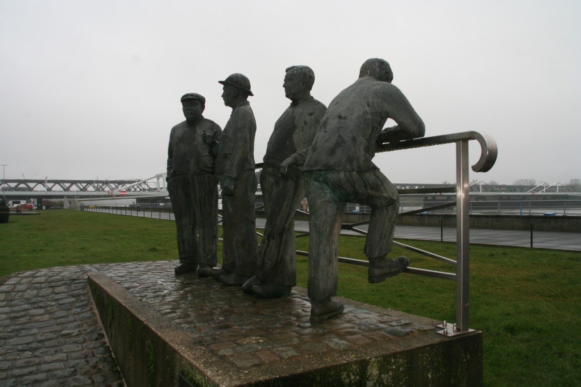 Beeldengroep gebaseerd op authentieke kaailopers (scheepslossers en -laders van voor de Tweede Wereldoorlog) met name Alfons Gosselin (den bruine), Désiré Aelbrecht (de mekker) en Frans Vervynckt (de schele wringer).