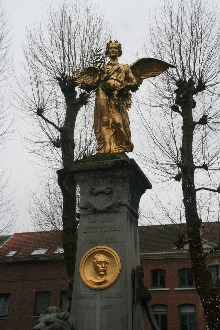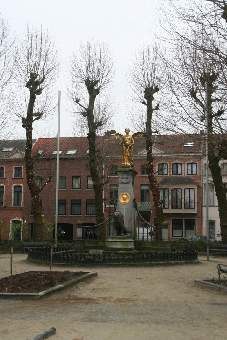 Regentieplein met Rolliersmonument. Het bouwwerk bestaat uit een vergulde bronzen engel op een granieten zuil met ervoor een leeuw. In de zuil zit een bronzen medaillon verwerkt.