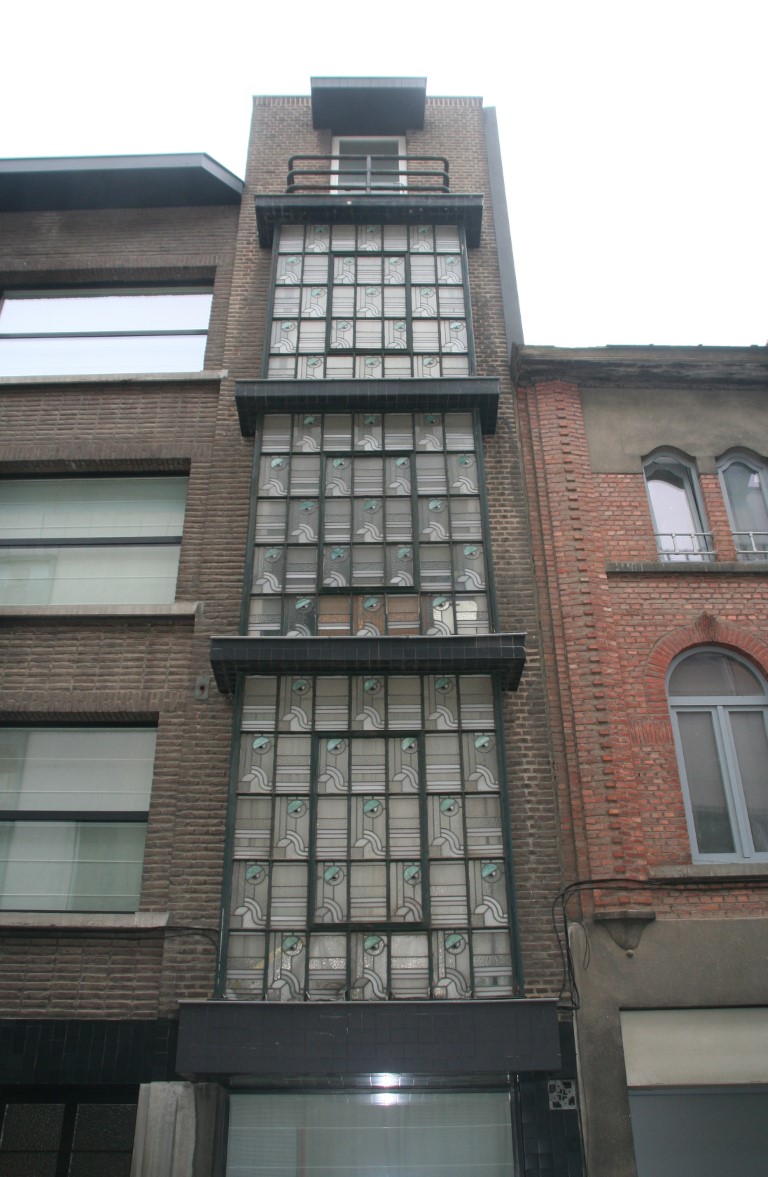 Rijhuis van twee bouwlagen in 1935. Bakstenen parement op hoge arduinen sokkel. Rechthoekige deur en vensters. Overkragend bakstenen balkon (staand metselverband) in de deurtravee uitgewerkt als ronde, boven de kroonlijst uitlopende erker. Laatste travee met twee gevelhoge, gekoppelde smalle rechthoekige vensters. Alle vensters met opmerkelijke glas-in-loodopvulling in art-Deco stijl.