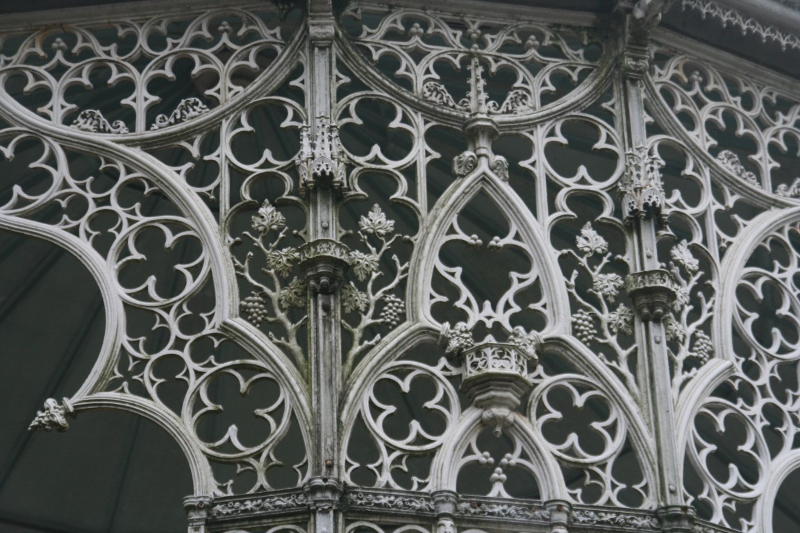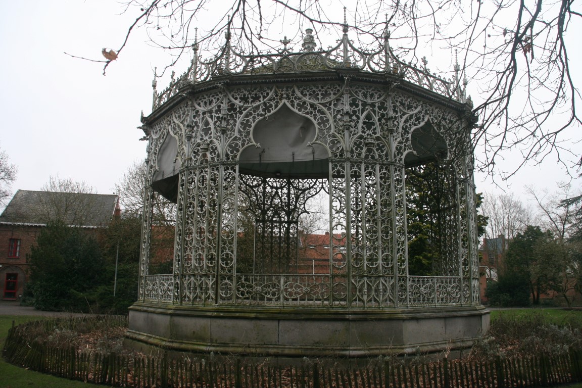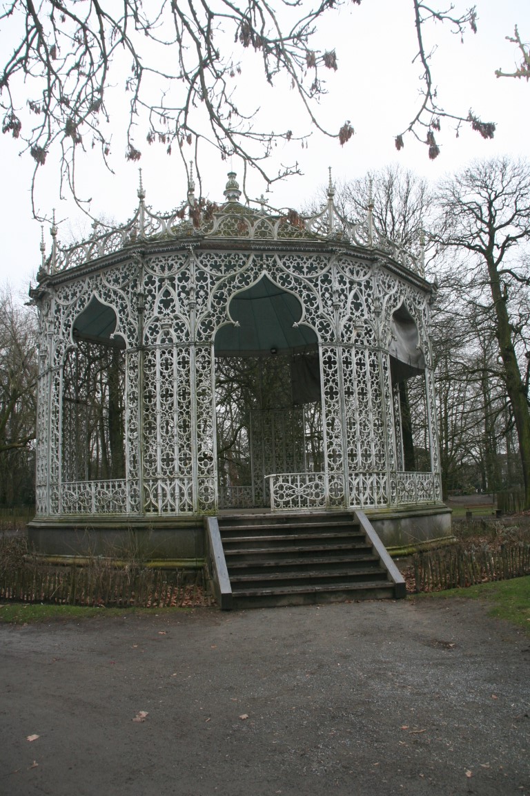 De muziekkiosk van Sint-Niklaas is een bijzonder sierlijke gietijzeren constructie in eclectische stijl, met Moorse inslag in de hoefijzerbogen en neogotische invloed in de met vierlobben en visblazen opengewerkte panelen. Hij is de enige in zijn soort die nog bestaat. Op 29 april 1859 werd een contract gesloten voor de levering van een gietijzeren kiosk naar het model van die in Mechelen. De onderbouw werd volledig in blauwe steen van Feluy in Henegouwen uitgevoerd. De kap, die oorspronkelijk in hout was voorzien werd op aandringen van de gieterij Van Aerschot, in ijzer gemaakt en bedekt met zink. Uiteindelijk werd de kiosk ter plekke gemonteerd in een wandelpark, genaamd De Warande, aan de Grote Markt, tijdens de maanden april en mei 1860.