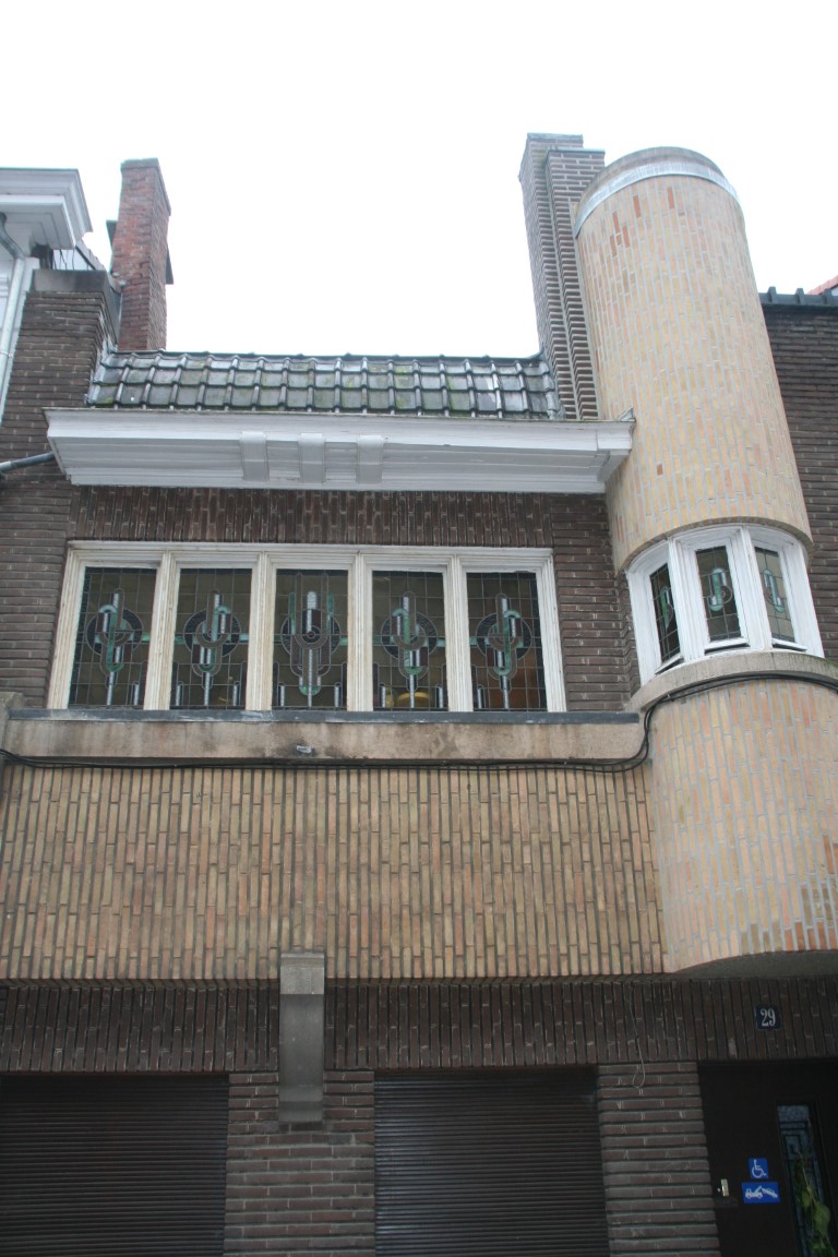 Op 14 maart 1931 ontworpen burgerhuis, een functioneel baksteengebouw met een gevelhoge, erkervormige glazen massa met kleine facetten en glas-in-lood rechts en brede, rechthoekige ramen links. Dit alles in Art-Deco stijl