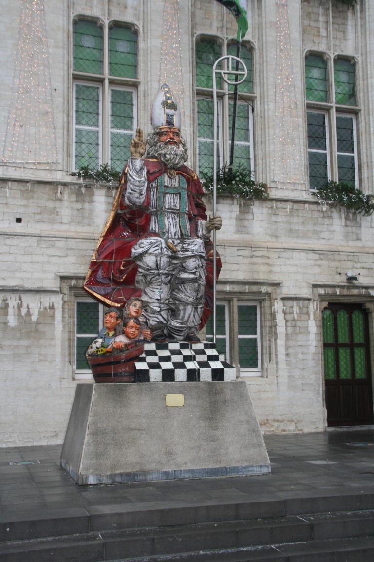 Aan de voet van het belfort van het stadhuis op de Grote Markt bevindt zich het imposante beeld van Sint-Nicolaas. In 1217 werd hij de patroonheilige van de toenmalige parochie en dorpsgemeenschap. Sint-Nicolaas, in de volksmond bekend als Sinterklaas, is de grote kindervriend. Het beeld verwijst naar de traditie rond de heilige Nicolaas, bisschop van Myra (+/- 280 -342/352). De hoge mijter, de rode mantel en de staf zijn de herkenbare attributen. Op zijn troon maakt hij een zegenend gebaar. Aan de voet van de troon staren drie kinderen de kijker aan. Ze zitten in een houten slagerskuip. Volgens de legende heeft Sinterklaas hen gered van een gewisse dood. Later wordt Sinterklaas de man die de brave kinderen speelgoed brengt. Op de rugleuning van de troon prijken een luchtballon en de Wase raap, beide symbolen van de stad en de regio.