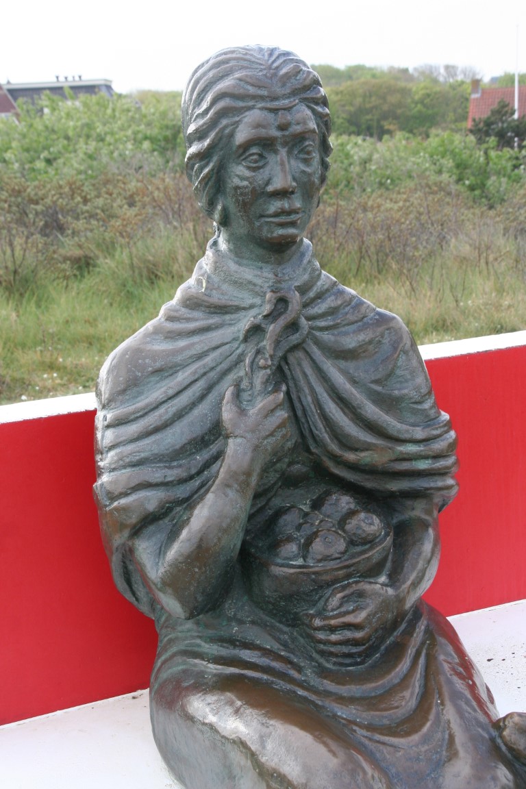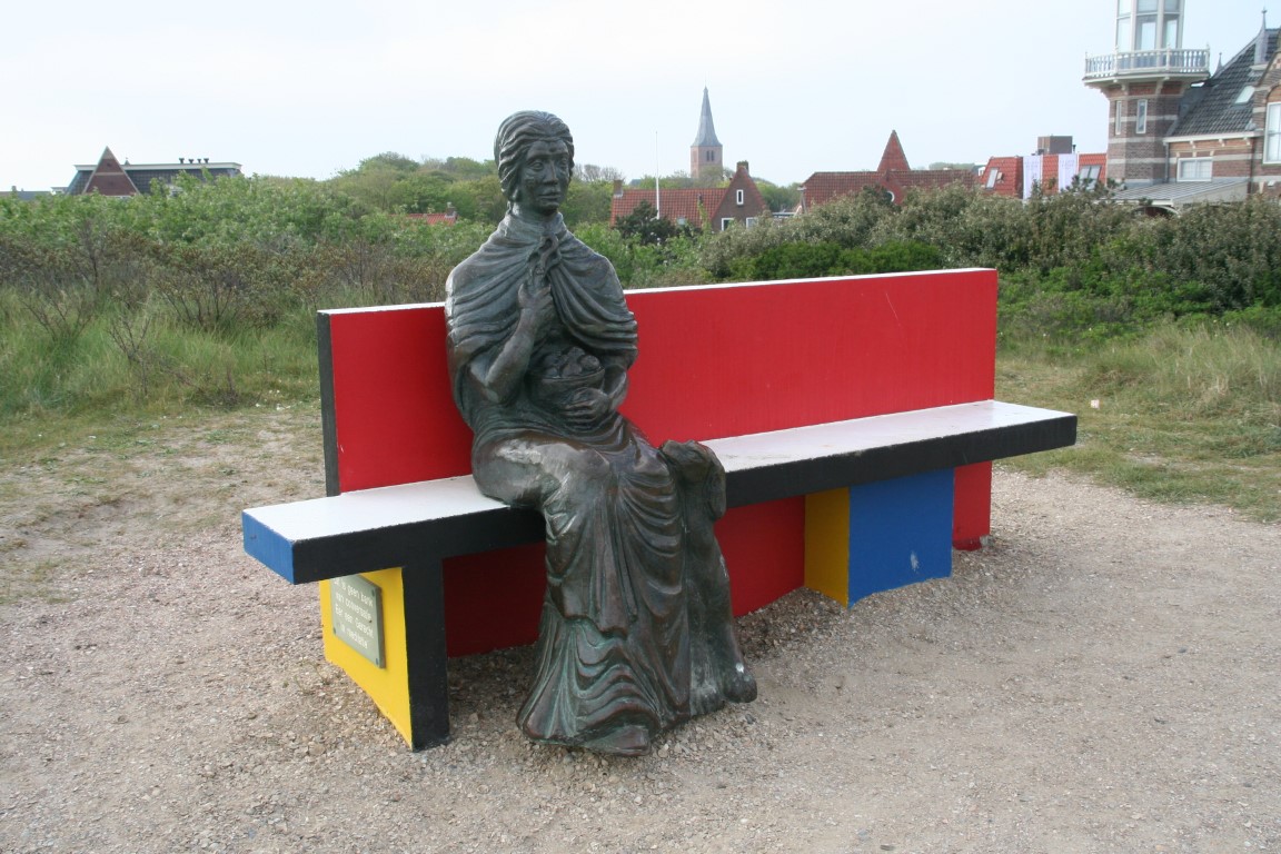 De Mondriaanbank verbindt heden met verleden. De inheemse godin Nehalennia, er is geen uitsluitsel of het om een Keltische of een Germaanse godin gaat of dat zij uit een oudere traditie stamt, vaak afgebeeld met een hond aan haar voeten en een schaal appels op haar schoot, was in de Romeinse tijd vermoedelijk een beschermgodin voor scheepvaart en handel. In de Romeinse tijd stond er aan de Domburgse kust een tempel van Nehalennia.