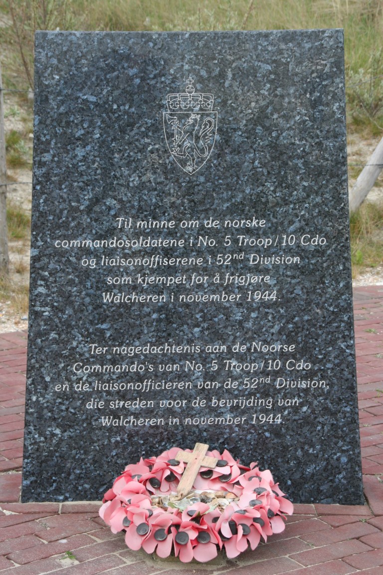 Het ‘Monument voor Noorse Commando’s’ in Domburg is opgericht ter nagedachtenis aan negen Noorse Commando’s van No. 5 Troop/10 Cdo. en de liaisonofficieren van de 52nd. Division, die zijn gesneuveld bij de strijd om de bevrijding van Walcheren in november 1944.