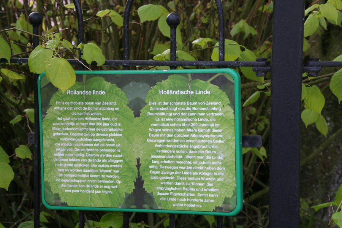 Deze oudste Zeeuwse linde staat op het voorplein van Kasteel Westhove. De leeftijd van deze boom is een lastig vraagstuk. Het informatiebord bij het kasteel dicht de boom een leeftijd toe van 750 jaar. De stamomvang van de boom (450cm) maakt het aannemelijk dat de boom veel jonger is en uit het begin van de 18e eeuw stamt. Er gaat ook een verhaal dat deze linde opnieuw is gegroeid uit de oorspronkelijke wortel wat goed mogelijk is bij een linde. Deze stamdelen van deze levenslustige linde worden bij elkaar gehouden door stangen en kabels.