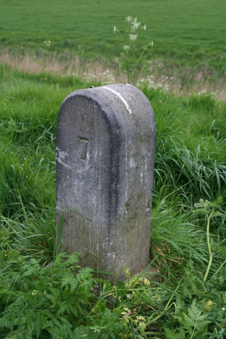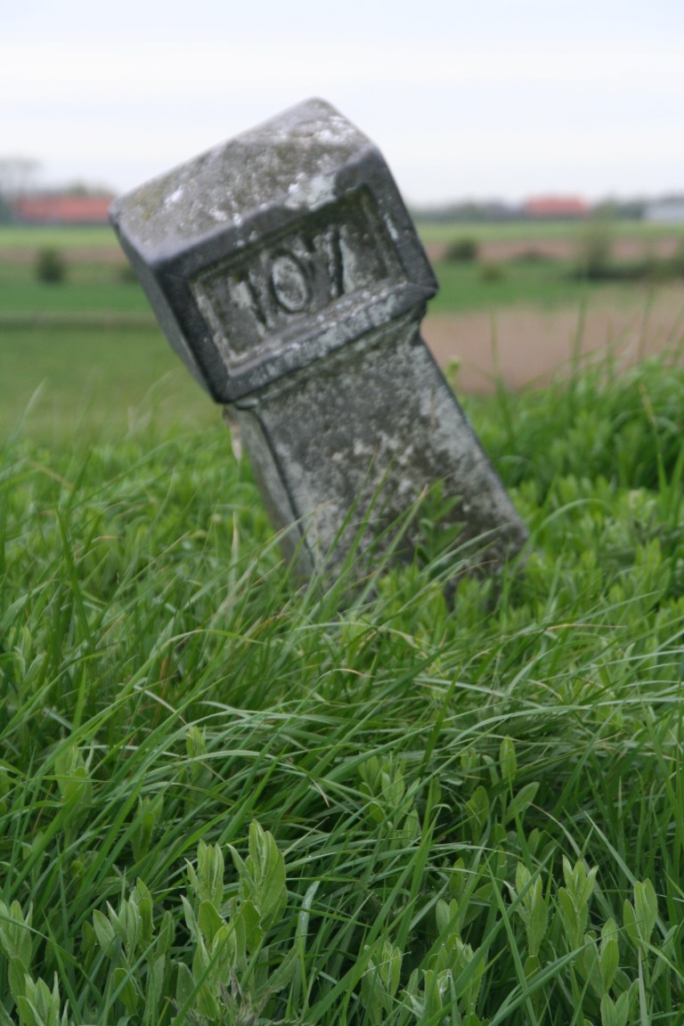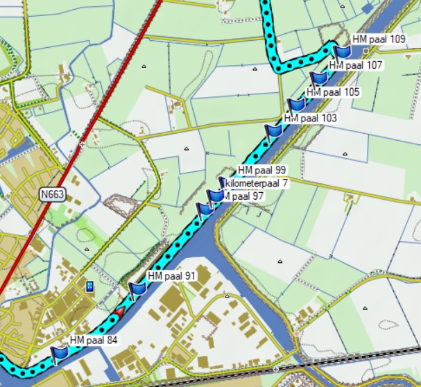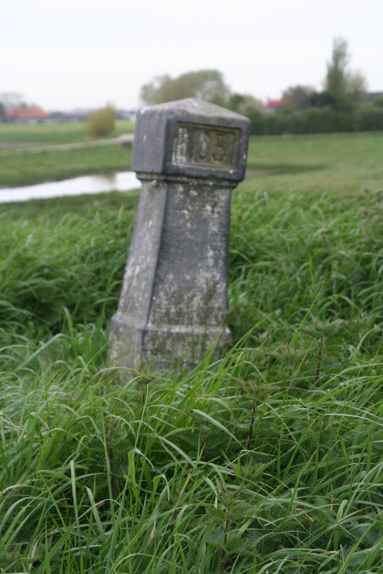 Langs het kanaal vinden we een aantal hectometerpalen en één bijbehorende kilometerpaal