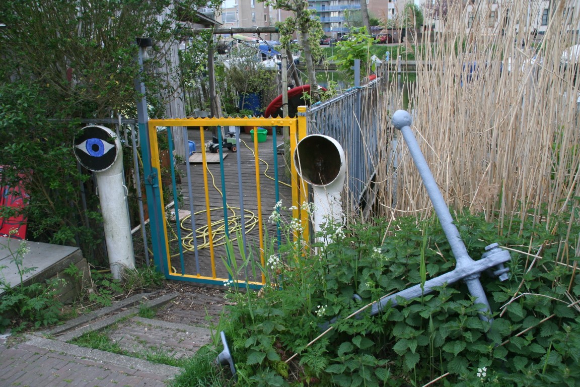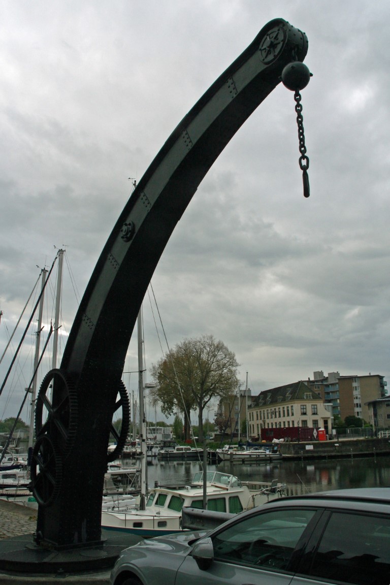 Havenkraan, bestaande uit een gebogen kokervormige arm van geklonken ijzer met aan weerszijden van de arm tandraderen voor het windwerk. Door