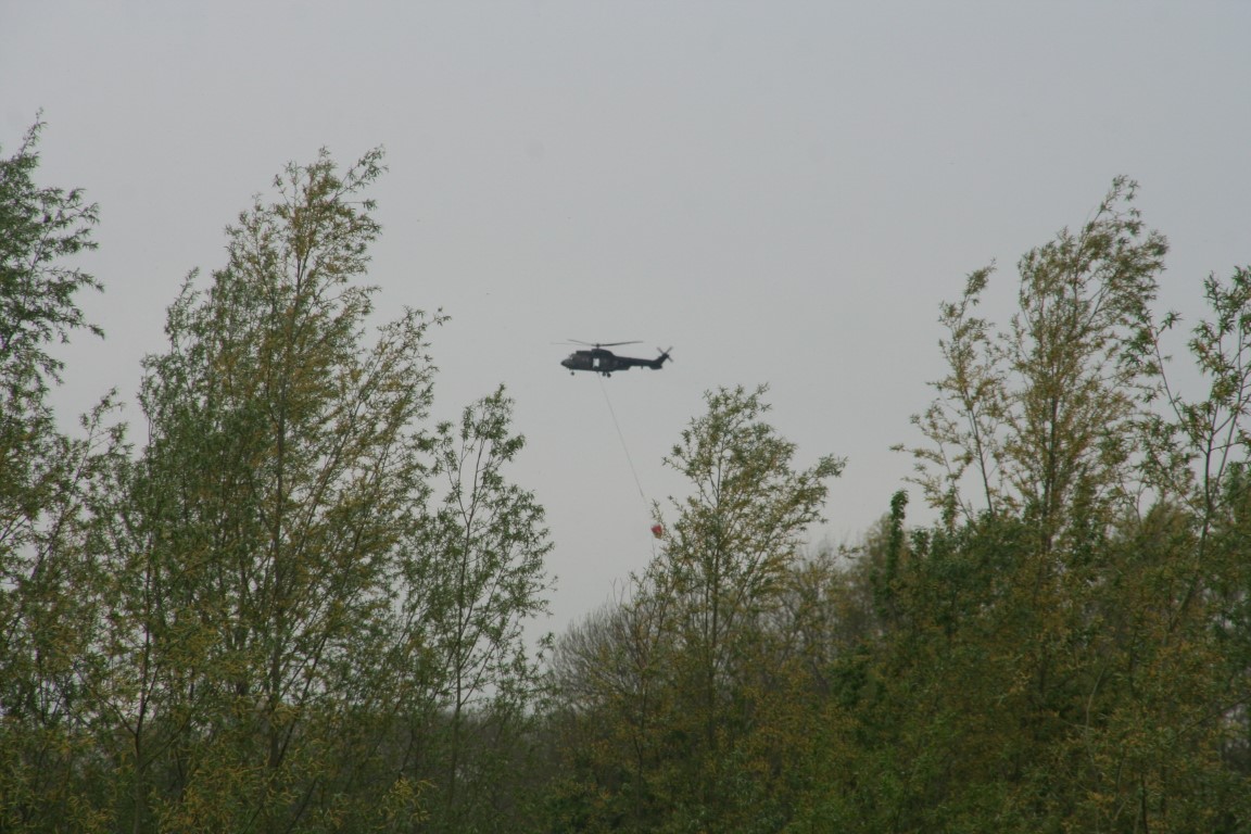 Tijdens de wandeling zien we in de verte een helikopter die met enige regelmaat water uit de Bergsche Maas komt halen.