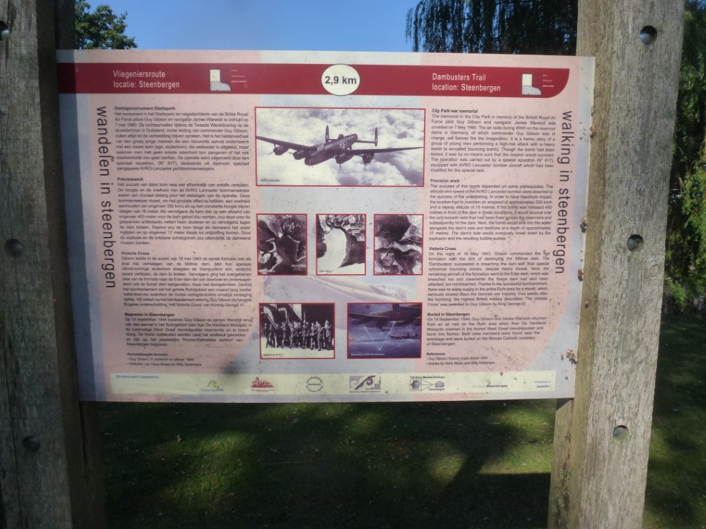 In mei 1943 was Guy Gibson ‘Wing Commander’ van negentien Lancaster-bommenwerpers die een aanval op de Duitse Ruhrdammen moesten uitvoeren. Hiervoor was een speciale bom ontworpen door Barnes Wallace. Na lang oefenen door geselecteerde bemanningsleden in Engeland werd op 16 mei 1943 de aanval op de dammen uitgevoerd (Möhne/Eder/Sorpe/Lister). Van de negentien bommenwerpers met 133 bemanningsleden keerden negen niet terug. 56 bemanningsleden verloren hierbij hun leven. Enkelen op de heen- of terugweg boven Nederland. De overigen sneuvelden bij de aanval. Guy Gibson is bij een latere opdracht in een Mosquito met zijn navigator Jim Warwick neergeschoten. Om de radar te ontwijken vloog hij zo laag, dat een dijk hem fataal is geworden.